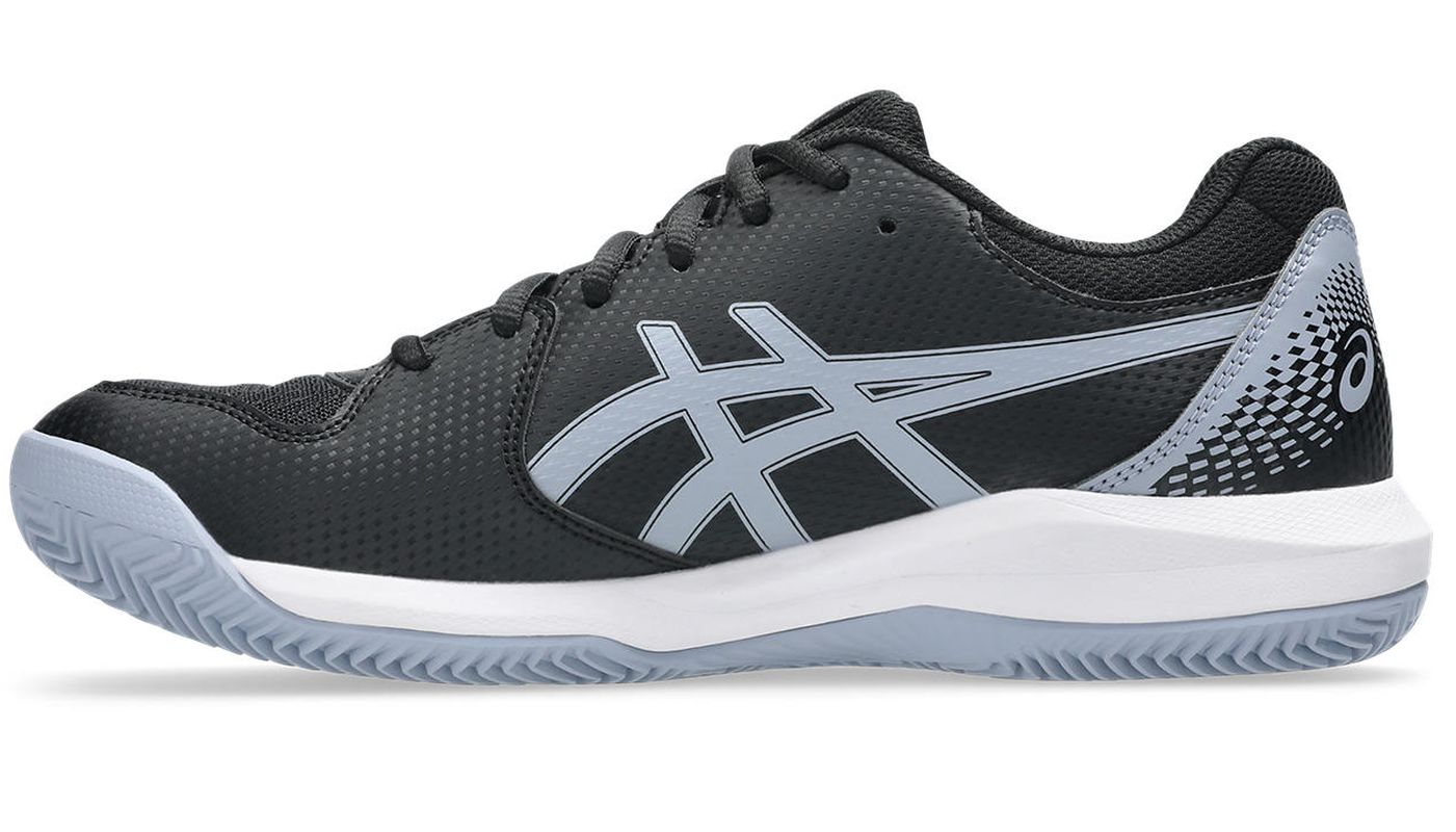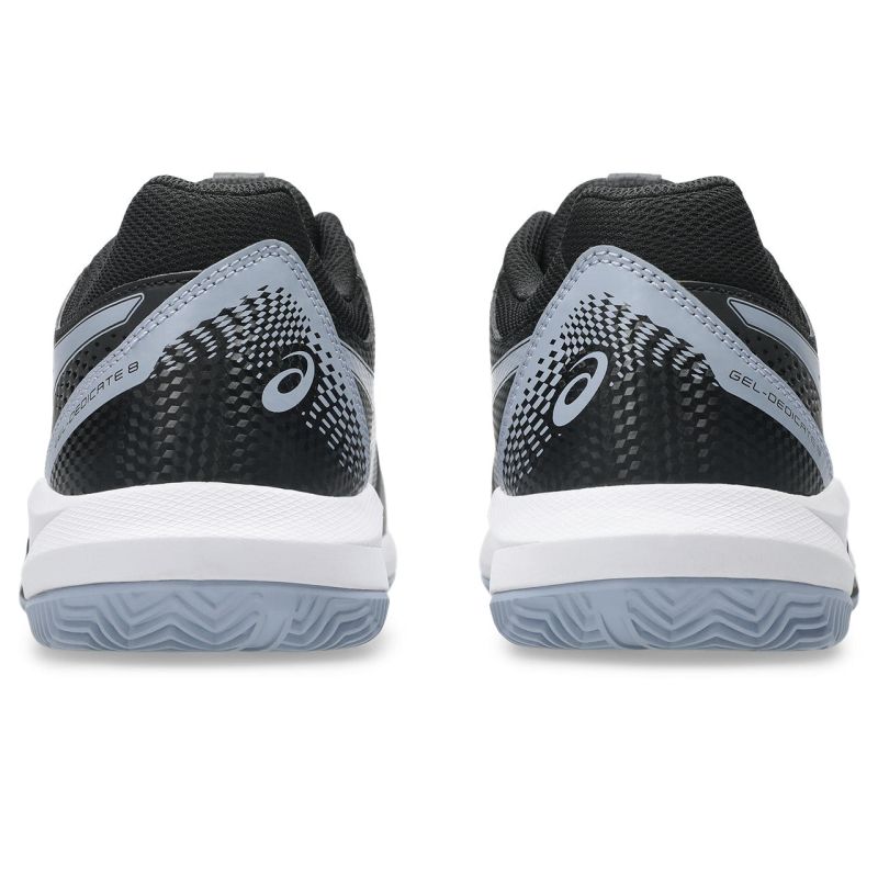 Теннисные кроссовки Asics Gel-Dedicate 8 Clay - black/grey blue. Обновленная версия модели Gel-Dedicate сочетает хорошую амортизацию и стабилизацию с высокой прочностью. Это обувь с более узким, идеально облегающим стопу кроем. Сетчатая передняя часть верха увеличивает воздухопроницаемость. Зоны, подверженные истиранию, обшиты и усилены накладками из синтетической кожи, что обеспечивает дополнительную поддержку стопы и хорошую износостойкость. Система Forefoot GEL Cushioning System в средней подошве обеспечивает оптимальную амортизацию, а технология Trussticsystem повышает комфорт и боковую стабильность. Модель имеет подошву, предназначенную для игры на грунтовых кортах, выполненную из прочной резины AHAR+.