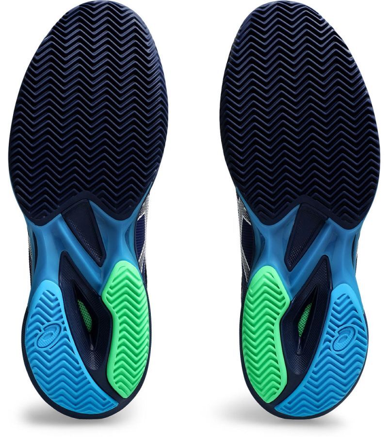 Теннисные кроссовки Asics Solution Speed FF 3 Clay - blue expanse/white. Обновленная до новейших технологий версия самой быстрой модели теннисных кроссовок Asics. Легкая, гибкая и чрезвычайно динамичная конструкция обуви обеспечивает отличное ускорение при переходе от полной остановки к спринту, что позволяет увеличить охват игрового поля игроком. Переработанный верх из более плотно сплетенной сетки повышает вентиляцию, а усиления AHAR+ в стратегических местах улучшают долговечность при сохранении малого веса. Средняя подошва из энергетической пены FLYTEFOAM гарантирует первоклассную амортизацию и феноменальный отскок, а ее обогащение технологией 3D SPACE CONSTRUCTION дополнительно поддерживает определенные области стопы. Алгоритмически сгенерированный протектор обеспечивает лучшую сцепку в области пятки и пальцев. Также применена система SPEEDTRUSS, увеличивающая стабильность при боковых и косых движениях. Обувь оснащена подошвой, предназначенной для игры на глиняных кортах.