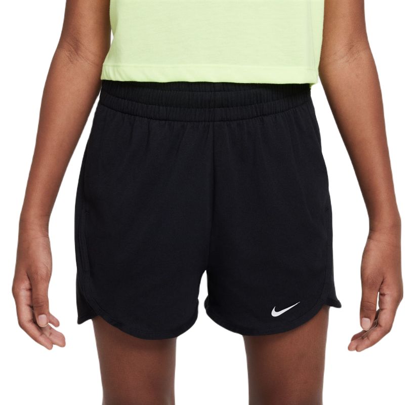 Девочьи шорты Nike Dri-Fit Breezy High-Waisted Training - black/white. Широкая, прочная резинка в поясе вместе с регулировкой в виде шнурков обеспечит идеальную посадку по фигуре. Два боковых кармана с внутренней сеткой для хорошей вентиляции. Шорты выполнены в технологии: DRI-FIT.