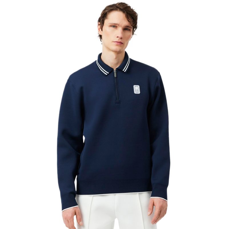 Мужская куртка Lacoste Tennis Heritage Polo Collar Zipped - midnight blue. Стильная куртка с элегантным воротником-поло, выполненная в классическом крое. Застегивается на короткую молнию, что обеспечивает высокий комфорт использования. Два больших перфорированных боковых кармана с открытым доступом. Рукава и нижний край куртки завершены суженным эластичным материалом, обеспечивающим хорошую посадку по фигуре и удобство ношения. Высокое качество исполнения и используемых материалов. Применена технология ULTRA DRY.