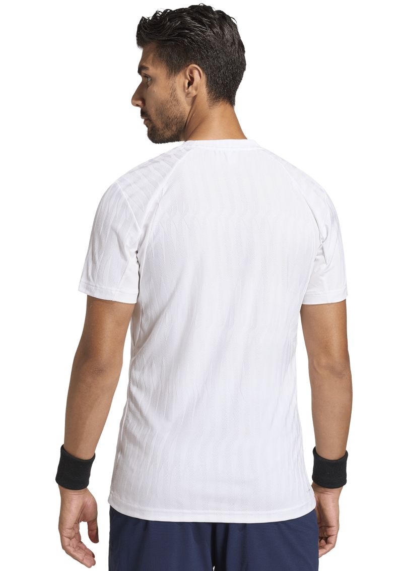 Теннисная футболка Adidas Climacool+ Freelift Airchill - white. Стильная футболка приталенного кроя с округлым вырезом под шею. Изготовлена из легкого и комфортного полиэстерового материала. Эластичная ткань подстраивается под движения, обеспечивая свободу, а удлиненная спинка повышает защиту и комфорт во время активности. Полностью выполнена из перфорированного материала, который в сочетании с дополнительными зонами mesh-панели гарантирует оптимальную вентиляцию. Футболка изготовлена из дышащей, эффективно отводящей влагу ткани. Высокое качество исполнения и используемых материалов с применением технологии CLIMACOOL.