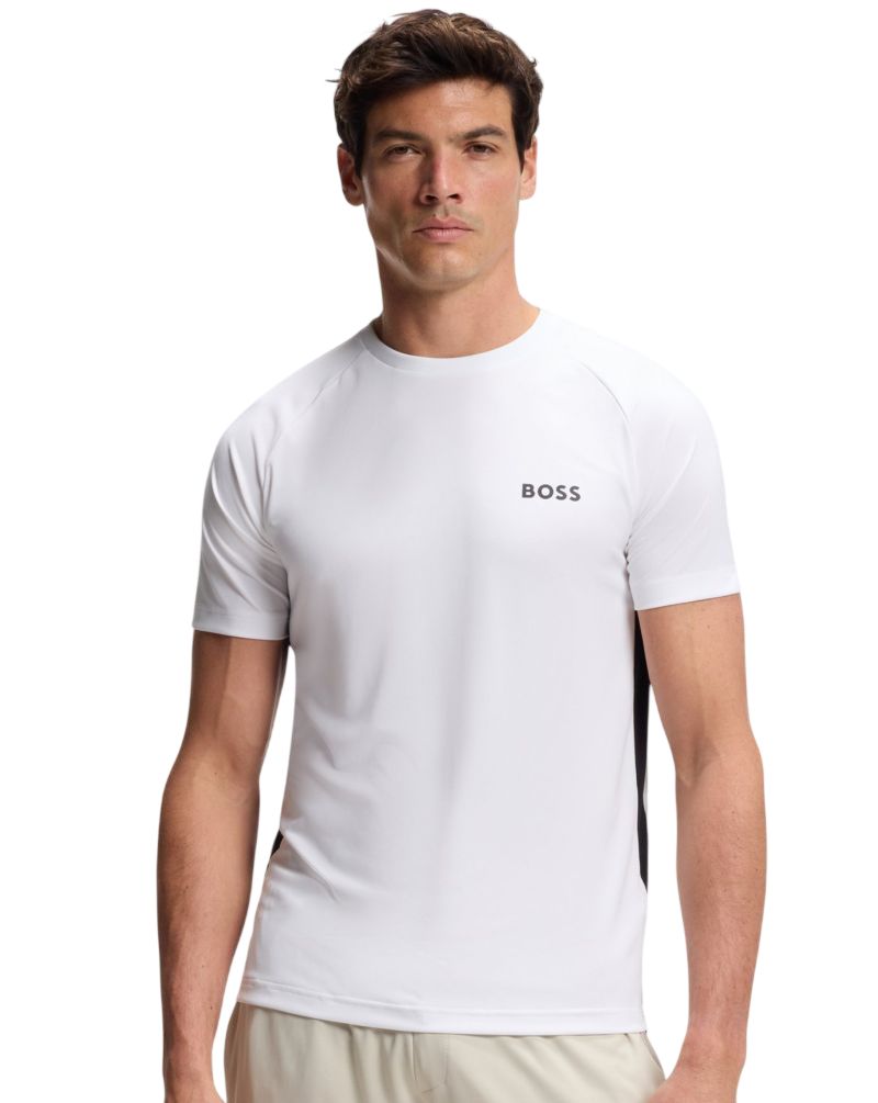 Теннисная футболка BOSS TOC Spin - white. Стильная slim-fit футболка, выполненная из эластичного материала, хорошо облегает тело, обеспечивая высокий комфорт во время активности. Логотип производителя слева. Высшее качество материалов гарантирует комфорт использования. Футболка выполнена из дышащего материала с применением технологий: MOISTURE MANAGEMENT, QUICK DRY, 4-WAY STRETCH.