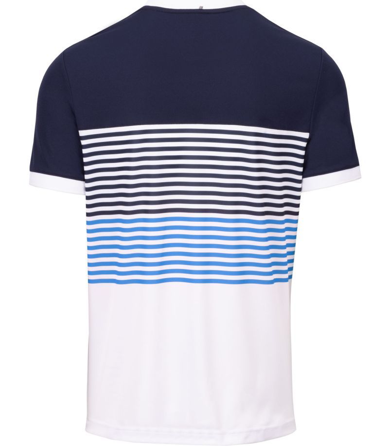 Теннисная футболка Fila BB1 - white/navy/simply blue. Легкая, дышащая теннисная футболка стандартного кроя. Выполнена целиком из дышащего и хорошо отводящего влагу полиэстерового материала, который также обеспечивает свободу движений. Логотип производителя на левой груди.