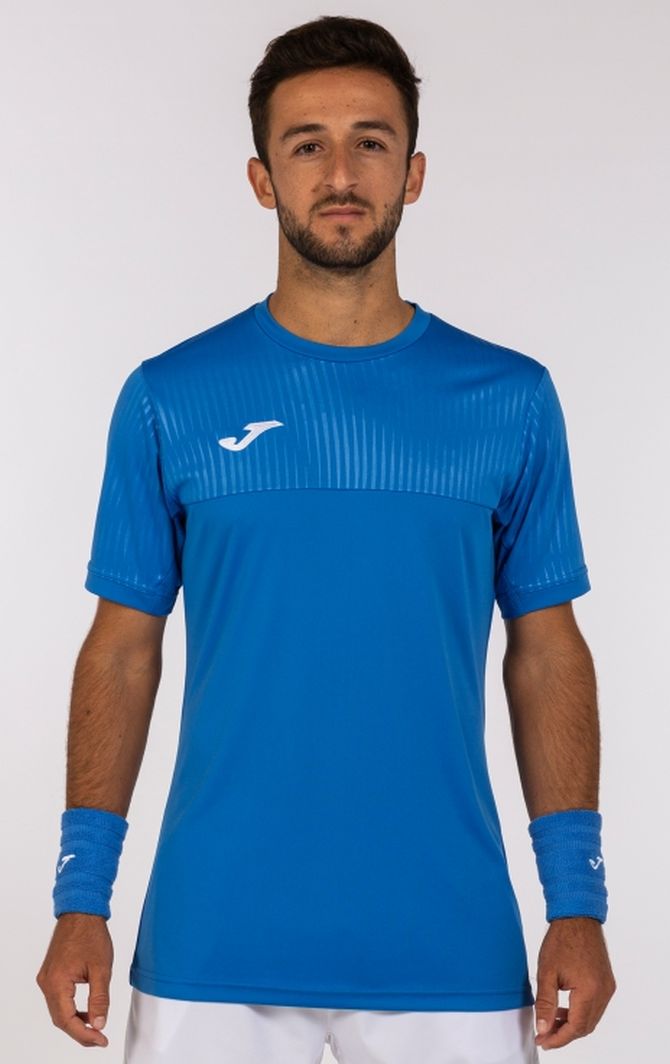 Теннисная футболка Joma Montreal Short Sleeve M - Royal. Необычайно лёгкая T-shirt, полностью выполненная из гладкого полиэстрового трикотажа. Материал эластичный и слегка растяжимый, благодаря чему идеально прилегает к фигуре. Рукава с перфорированными зонами повышают воздухопроницаемость. Вышитый логотип производителя виден на правой груди.