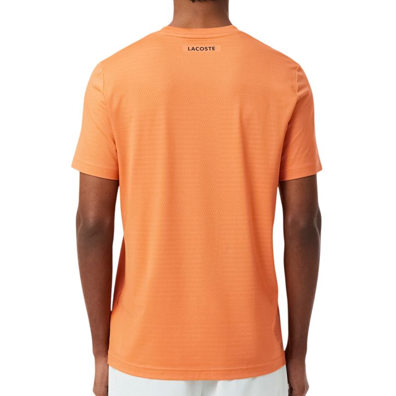 Теннисная футболка Lacoste Ultra Dry Stretch Tennis - orange. Стандартная футболка выполненная в простом крое обеспечит удобство ношения. Выполнена целиком из микро-перфорированного материала для обеспечения лучшей вентиляции и большего комфорта во время активности. Легкая слегка растяжимая футболка хорошо приспособится к движениям обеспечивая свободу. Футболка украшена логотипом производителя на левой груди. Высокое качество исполнения и используемых материалов. Футболка выполнена с применением технологии: ULTRA DRY.