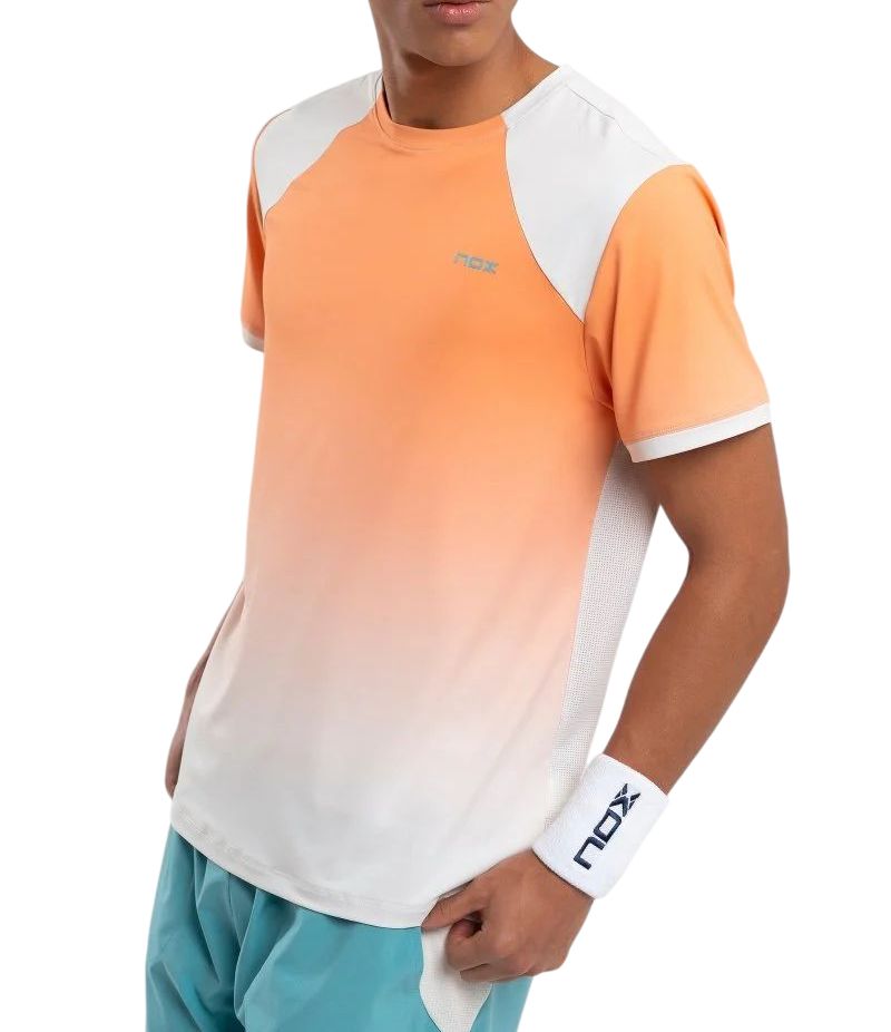 Теннисная футболка NOX Pro - orange degraded. Классическая техническая T-shirt с регулярным кроем. Нежноэластичная ткань отлично подстраивается под движения спортсмена, обеспечивая хорошую посадку по фигуре с необходимой свободой движений во время активности. Перфорированные зоны на спине и под мышками гарантируют высокую воздухопроницаемость. T-shirt изготовлена из высококачественного, комфортного материала с применением технологии Balance Fresh.