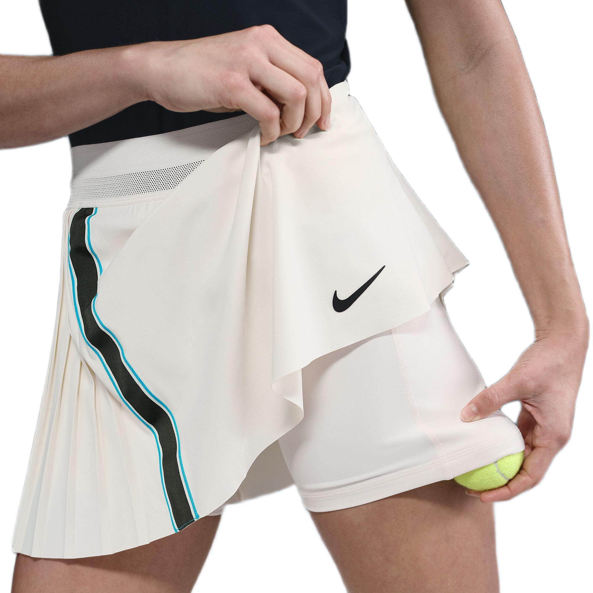 Женская юбка Nike Court RG Dri-FIT Slam Tennis - pale ivory/pale ivory/black. Стильная юбка асимметричного кроя с плиссированной вставкой сбоку. Широкий эластичный материал в поясе гарантирует идеальную посадку по фигуре, обеспечивая максимальный комфорт. Легкие разрезы внизу увеличивают диапазон движений, а удлиненный зад обеспечивает дополнительную защиту. В комплекте встроенные спортивные шорты с боковыми карманами для мяча. Примененные плоские швы минимизируют риск натирания и раздражения. Юбка изготовлена из дышащего, хорошо отводящего влагу материала с технологией DRI-FIT.