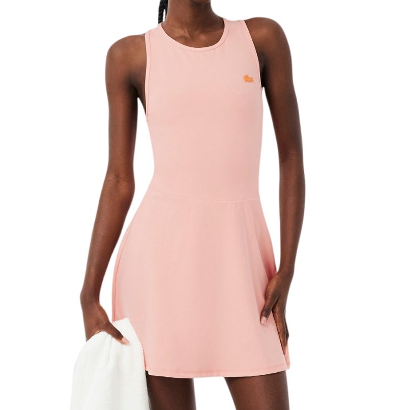 Женское платье Lacoste Ultra Dry Sport - rose/orange. Функциональное платье из легкого, эластичного материала, который обеспечивает наивысший комфорт и свободу движений на корте. Легко расклешенный низ добавляет платью женского шарма и обеспечивает полную свободу движений как во время игры, так и вне ее. Имеет отрез в талии, который подчеркивает силуэт спортсменки. Отдельно в комплекте спортивные шорты для обеспечения максимального удобства и комфорта. Плоские швы минимизируют риск натираний и раздражений. Высокое качество исполнения и используемых материалов. Платье выполнено из дышащего, эффективно отводящего влагу материала с применением технологий: STRETCH, ULTRA DRY, ODOR-CONTROL.