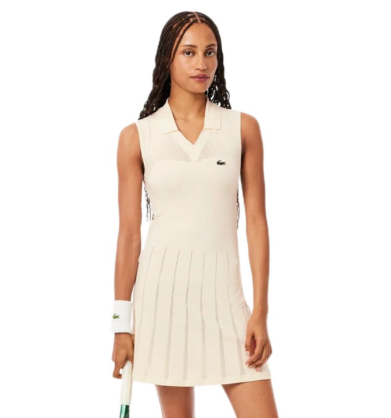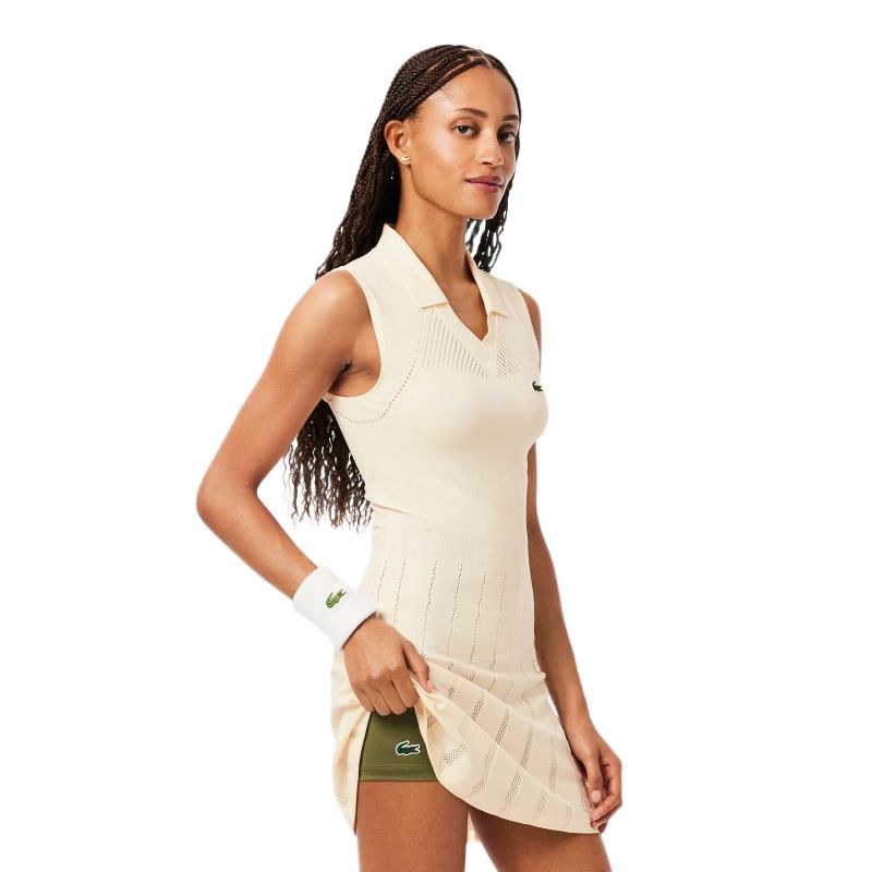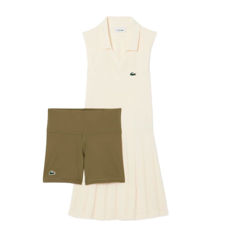 Женское платье. Теннисное платье Lacoste Ultra Dry Tennis - lapland/olive. Функциональное платье с вырезом V-образной формы, выполненное из легкого, эластичного материала, который обеспечивает наивысший комфорт и свободу движений на корте. Легко расклешенный низ добавляет платью женского шарма и обеспечивает полную свободу движений, как во время игры, так и вне ее. Многочисленные микро-перфорации гарантируют оптимальную вентиляцию и помогают поддерживать оптимальную температуру тела даже во время самых интенсивных матчей. Отдельно в комплекте спортивные шорты для обеспечения максимального удобства и комфорта. Плоские швы минимизируют риск натираний и раздражений. Высокое качество исполнения и используемых материалов. Платье выполнено из дышащего, эффективно отводящего влагу материала с применением технологий: BREATHABILITY и STRETCH.