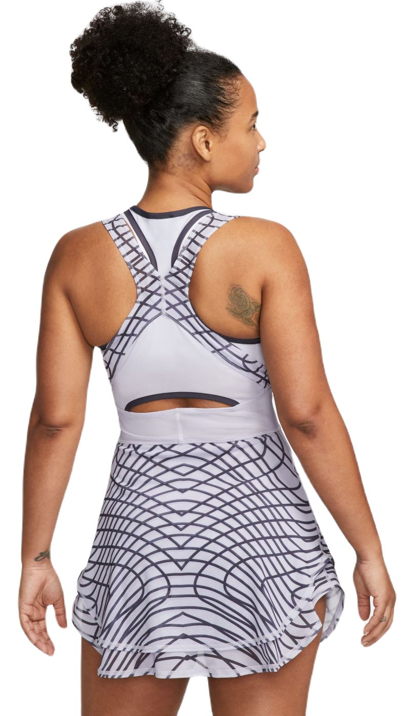 Теннисное платье Nike Court Dri-Fit Slam - oxygen purple/gridiron/black. Облегающее платье, подчеркивающее талию, полностью выполнено из вентилируемой сетки, обеспечивающей хорошую вентиляцию. Тонкие, слегка эластичные бретельки обеспечат хорошую посадку и свободу движений. Нижняя часть платья имеет двойной материал с нерегулярным кроем. Для повышения комфорта во время игры сзади небольшое вырезание. Платье выполнено в технологии DRI-FIT.