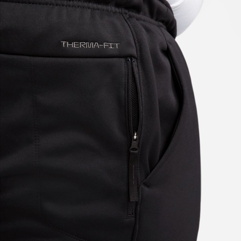 Мужские брюки Nike Therma Fit в черном цвете с белыми акцентами — отлично сохраняют тепло и обеспечивают комфорт благодаря узкому крою штанин. Регулируемый эластичный пояс со шнурком позволяет идеально подогнать изделие по фигуре. Модель оснащена двумя боковыми карманами с внутренней сеткой для улучшенной вентиляции, а также дополнительным закрывающимся на молнию карманом справа. Брюки выполнены с применением технологии THERMA-FIT, которая помогает сохранять оптимальную температуру тела.