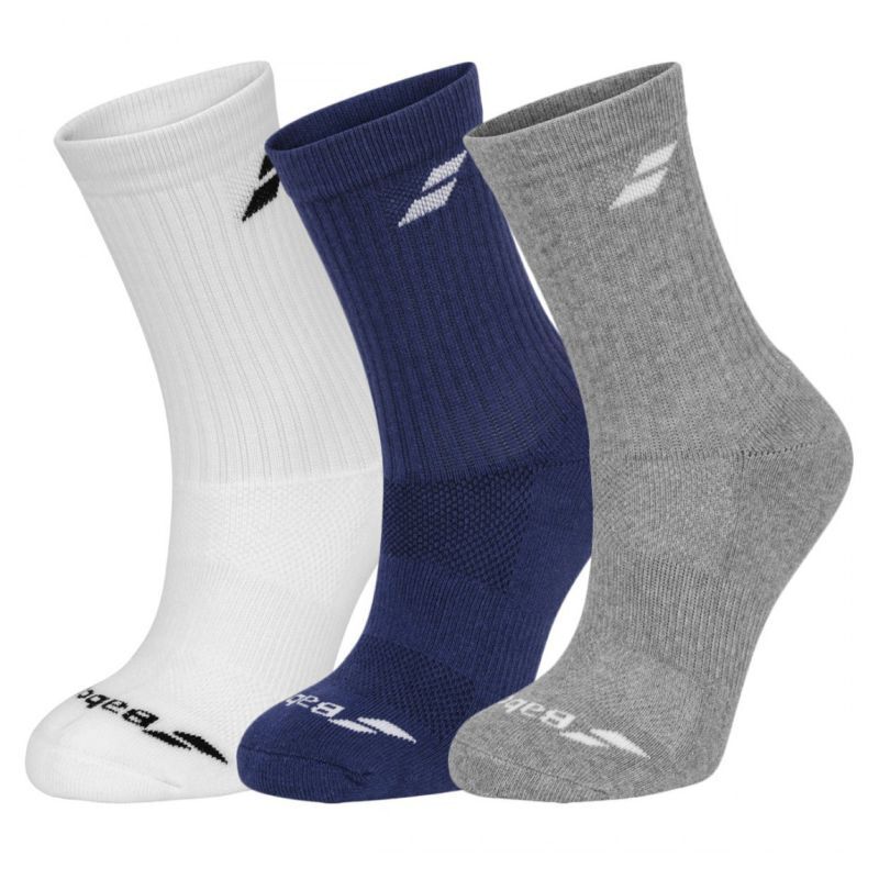 Теннисные носки Babolat Junior 3P - white/estate blue/grey. Сетчатая панель, расположенная на верхней части носка, эффективно отводит влагу наружу. Прочная ткань с амортизирующим усилением в ключевых местах. Защитные вставки над пяткой для предотвращения волдырей. Носки содержат большое количество хлопка, что обеспечит комфорт при ношении. Упаковка содержит 3 пары.