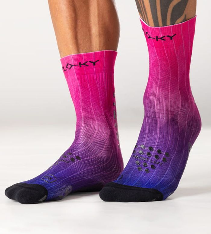 Инновационные биомеханические носки, спроектированные специально для ракеточных видов спорта, с учетом специфики перемещений на корте во время игры в теннис, падел или pickleball. Изготовлены из эластичных и прочных волокон, полученных из переработанного сырья. Приталенная, идеально облегающая стопу конструкция носков обеспечивает направленную защиту и большую стабильность голеностопного сустава и ахиллова сухожилия. Антискользящая система со спиральными аппликациями на подошве стопы предлагает отличное сцепление, надежно удерживая стопу во время динамических движений, а специальные усиления дополнительно защищают свод стопы и головку плюсневой кости. Патентованная плантарная компрессия FLOKY способствует удалению продуктов обмена веществ, что улучшает оксигенацию мышц и предотвращает травмы. Плоские швы минимизируют риск натираний или мозолей.