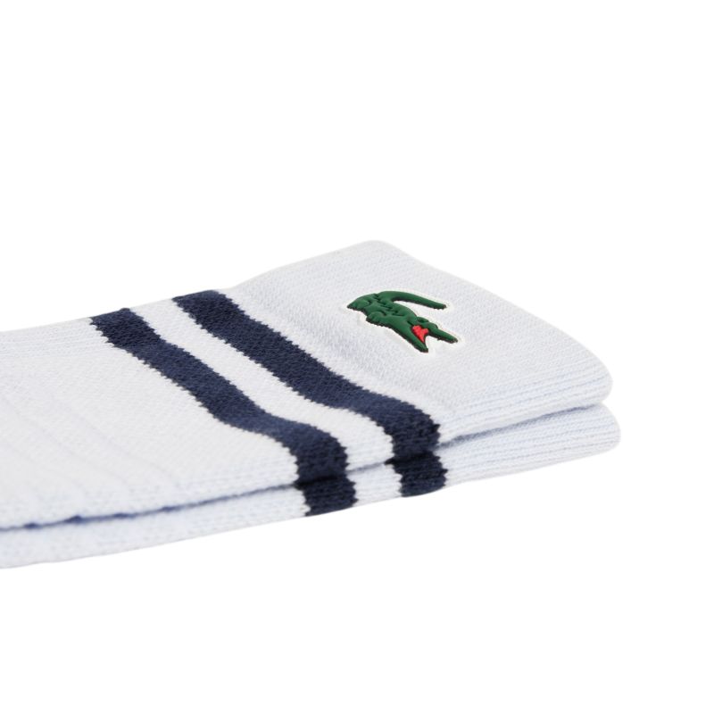 Носки Lacoste Breathable Jersey Tennis 1P - bleu clair/bleu marine. Выполнены из материалов высокого качества. Большое содержание хлопка гарантирует высокий комфорт использования. Ребристая отделка и ребристая поддерживающая полоса сверху обеспечат хорошую посадку. Носки украшены силиконовым логотипом производителя.