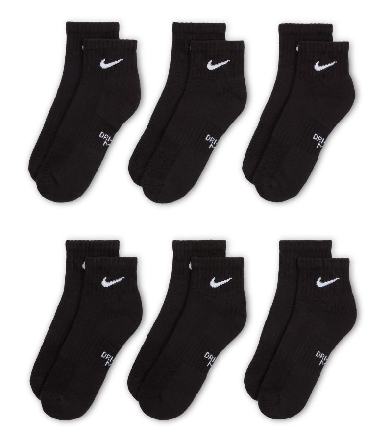 Носки Nike Everyday One Quarter 6P - black/white. Очень хороший комфорт во время игры в любых условиях. Толстая подошва из хлопка обеспечивает дополнительное удобство при движении, а волокна внутри стельки предотвращают сползание носков. Модель средней длины закрывает лодыжки. Выполнены из дышащего материала с использованием технологии DRI-FIT. Упаковка содержит 6 пар носков.