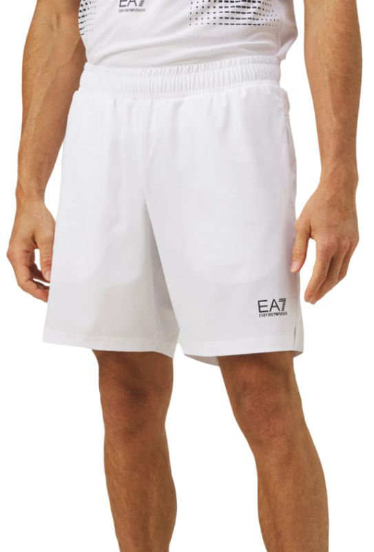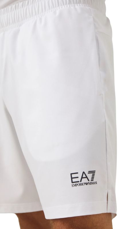 Мужские шорты EA7 Man Woven. Невероятно лёгкие и комфортные шорты простого, регулярного кроя. Легко растягивающаяся трикотажная ткань позволяет шортам подстраиваться под движения спортсмена. Эластичная резинка в поясе вместе с регулировкой в виде внутренних шнурков обеспечит отличную посадку по фигуре. Два боковых кармана из сетчатого материала для лучшей воздухопроницаемости. Разрезы в нижней части штанин обеспечивают больший диапазон и свободу движений. Шорты изготовлены из дышащего, эффективно отводящего влагу материала с применением технологии VENTUS7.