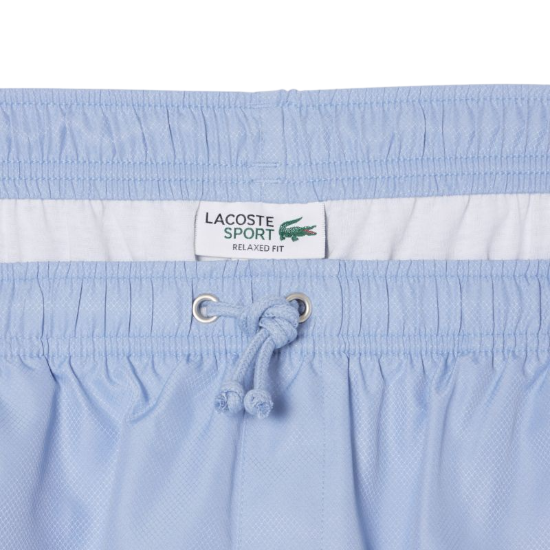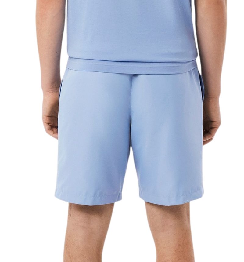 Мужские шорты Lacoste Lightweight Diamond Taffeta Sport - blue. Легкие и комфортные шорты прямого, регулярного кроя. Эластичная резинка в поясе вместе с регулировкой в виде шнурков гарантирует очень хорошую посадку по фигуре. Подкладка из комфортного материала обеспечивает поддержку и удобство. Плоские швы минимизируют риск натирания и раздражения. Шорты имеют два боковых кармана. Вышитый логотип производителя размещен на правой штанине. Высокое качество исполнения и используемых материалов.