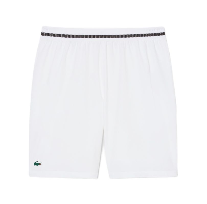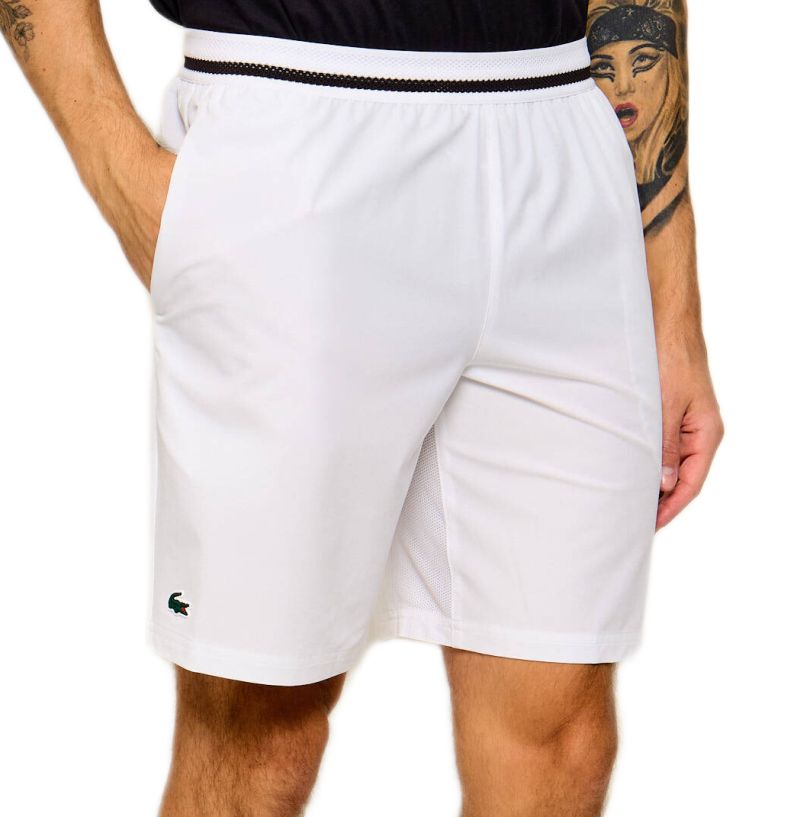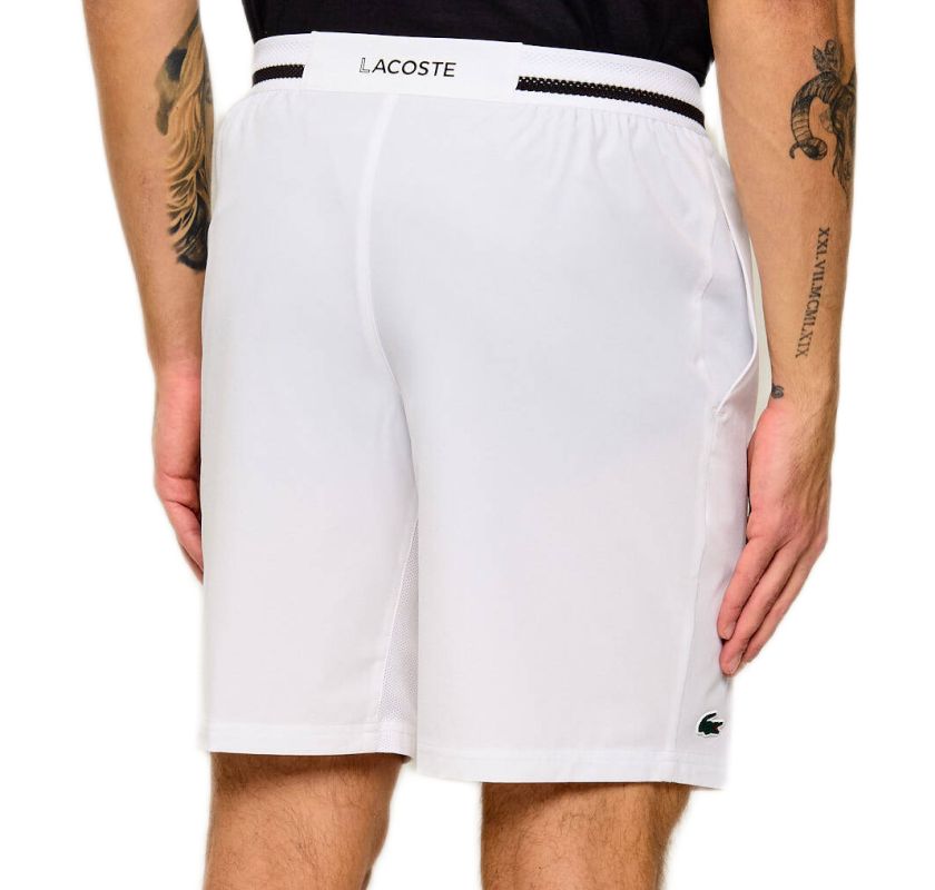 Мужские шорты Lacoste Tennis X Novak Djokovic - white/buffalo. Шорты с прямой штаниной, выполненные в регулярном крое, обеспечат высокий комфорт во время активности. Эластичная резинка в поясе вместе с внутренним шнурком позволит добиться хорошей посадки, а сетчатый материал обеспечит лучшую вентиляцию. Два боковых кармана с внутренней сеткой. Вставка из перфорированного материала между штанинами для повышения воздухопроницаемости. Шорты выполнены с использованием технологии: ULTRA DRY, STRETCH. Шорты из коллекции, созданной специально для Novaka Djokovica.