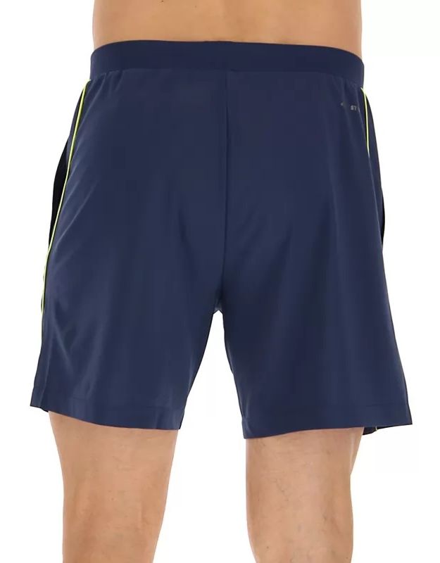 Мужские шорты Lotto Superrapida V Short - dark denim/acid yellow. Шорты изготовлены из быстросохнущего полиэстрового материала. Два глубоких кармана по бокам. Широкая резинка в поясе для идеальной посадки с дополнительным шнурком. Логотип производителя на левой штанине. Выполнены в технологии 4WAY STRETCH.