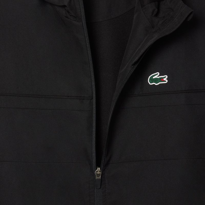 Мужской костюм Lacoste Diamond Taffeta Sport - black. Комплект спортивного костюма, состоящий из куртки и штанов, выполненный в простом, регулярном крое. Куртка застегивается на всю длину на молнию с внутренней сетчатой подкладкой для лучшей воздухопроницаемости. Интегрированный воротник вместе с капюшоном обеспечит удобство и защиту. Дополнительная регулировка в виде кулисок. Два боковых кармана на молнию. Штаны имеют эластичную резинку в поясе с регулировкой в виде внутреннего шнурка. Гладкая, мягкая подкладка обеспечит высокий комфорт и тепло во время носки. Два боковых кармана на молнию. Низ штанин завершён эластичной резинкой и короткой боковой молнией для повышения комфорта во время активности. Костюм выполнен с применением технологий: WATER REPELLENT, BREATHABILITY.