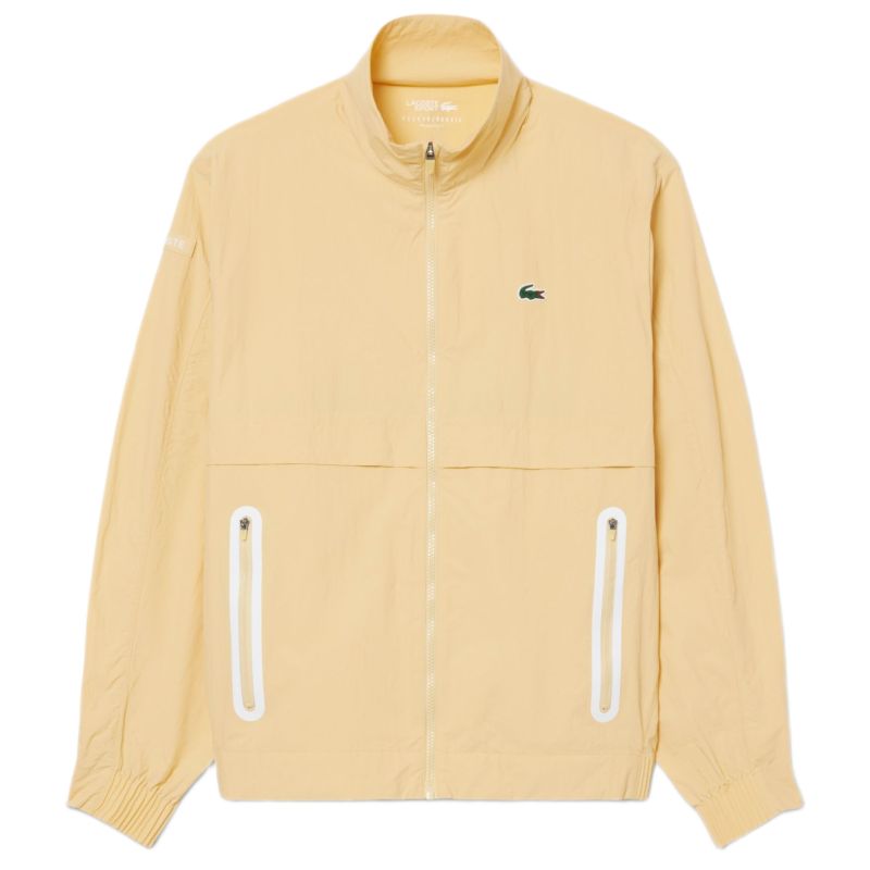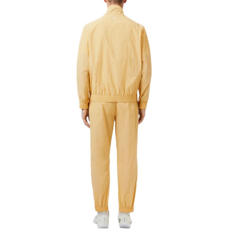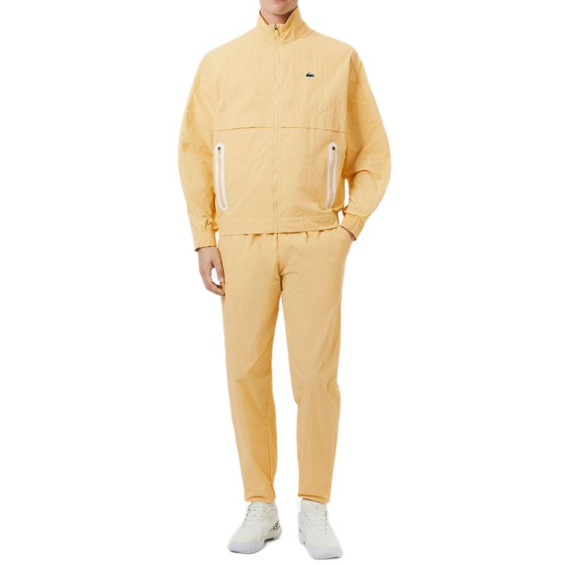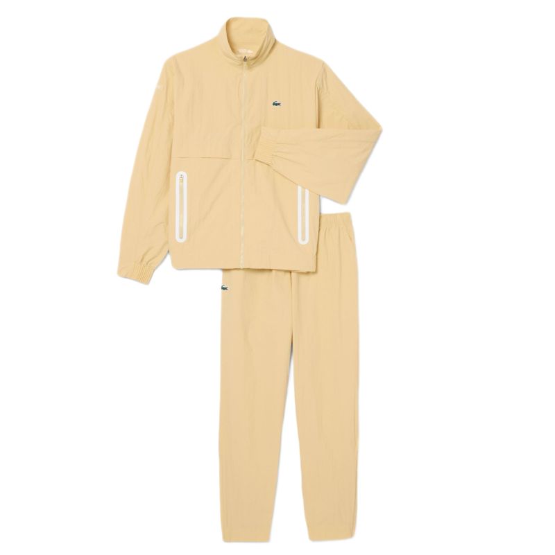 Мужской костюм Lacoste Tennis x Novak Djokovic - soya. Комплект костюма, сочетающий в себе толстовку и штаны, выполненный в простом, свободном крое. Толстовка застёгивается на всю длину на молнию. Легко приподнятый воротник обеспечит комфорт и защиту. Для лучшей посадки рукава и низ толстовки завершены сборчатым, эластичным материалом. Перфорации на спине обеспечат лучшую воздухопроницаемость. Два застёгивающихся боковых кармана с внутренней сеткой для обеспечения лучшей вентиляции. Штаны имеют эластичную резинку в поясе с регулировкой в виде шнурка. Два открытых боковых кармана. Низ штанин завершён эластичной резинкой. Костюм из коллекции Новакa Джоковича. Костюм изготовлен с применением технологии: Breathability.
