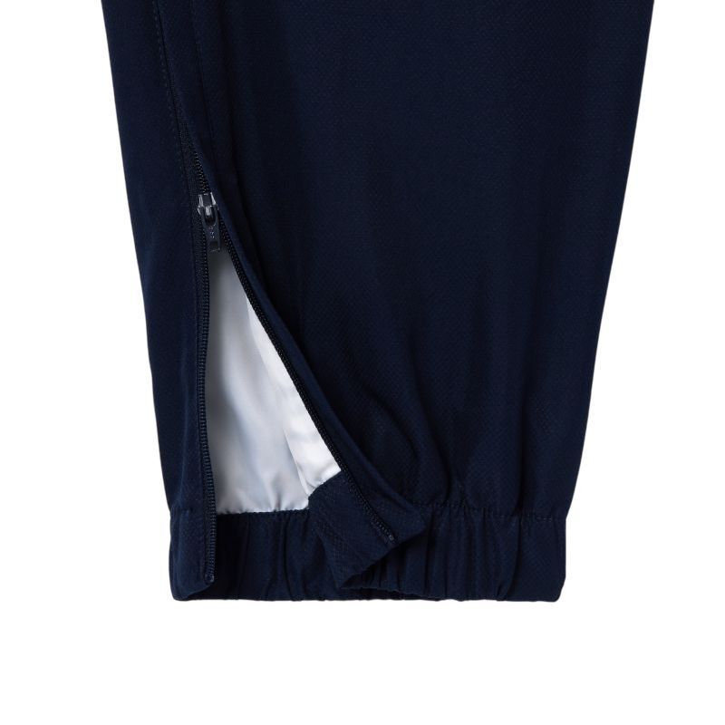 Мужские брюки Lacoste Sport Lightweight - navy blue. Классические спортивные брюки свободного кроя. Изготовлены из высококачественного полиэстерового материала, имеют внутреннюю подкладку из легкой смеси полиэстера и хлопка, которая обеспечивает защиту от холода и комфорт при носке. Эластичная резинка на поясе с регулировкой с помощью внутренних шнурков и эластичные манжеты на штанинах обеспечивают отличную посадку. Короткая боковая молния для дополнительного комфорта во время активности. Два боковых кармана с открытым доступом.