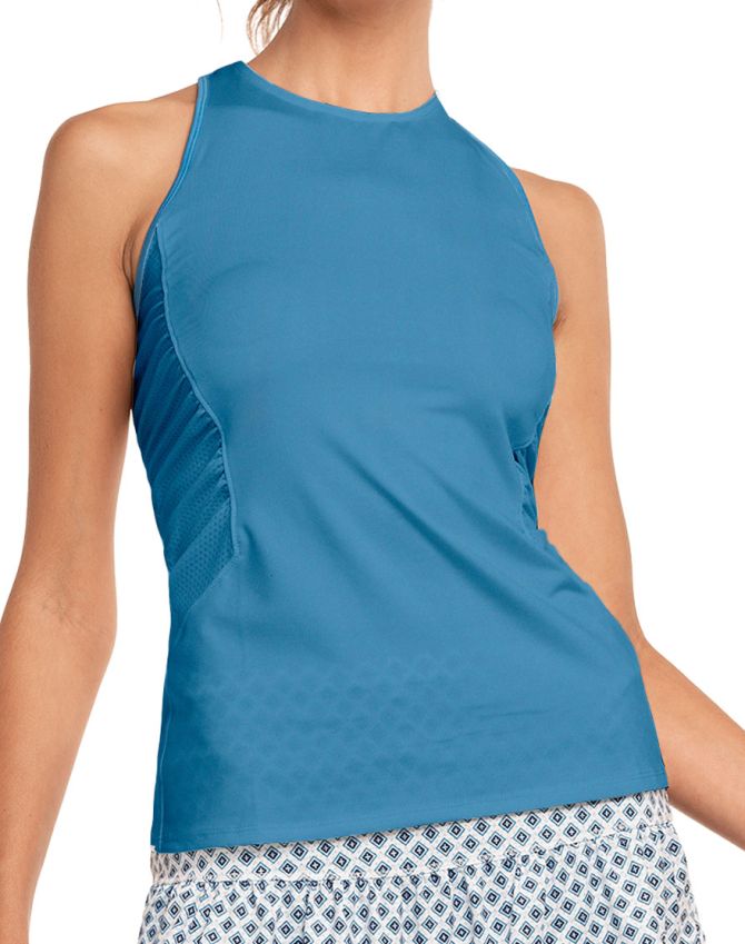 Топ теннисный Lucky in Love Playing In Paradise In A Ruche Tank - aegean blue. Стильный топ приталенного кроя. Эластичные бретельки повышают комфорт игры. Топ имеет высокий вырез, а боковые и задние зоны с mesh-панели повышают воздухопроницаемость. Изготовлен из гладкой, слегка эластичной ткани, с использованием технологии VAPORTEX.