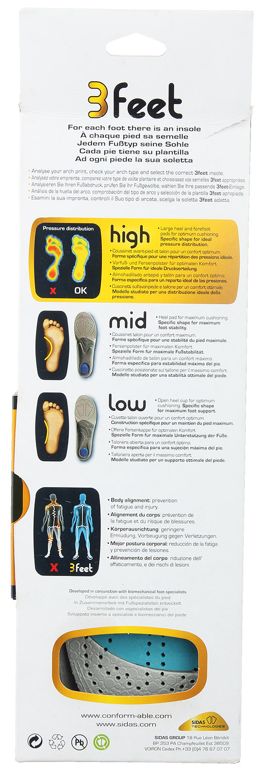 Французская компания SIDAS - мировой лидер в разработке технологий, улучшающих комфорт пользователей обуви, особенно спортивной. Своей миссией SIDAS определяет следующим образом: "Решения для каждой стопы, каждого вида физической активности, для повседневного использования. Везде во имя ваших стоп". После 30 лет опыта и развития производственная программа компании SIDAS включает 2 направления: Conform'Able (для повсеместного использования) и Podiatech (для медицинских специалистов).