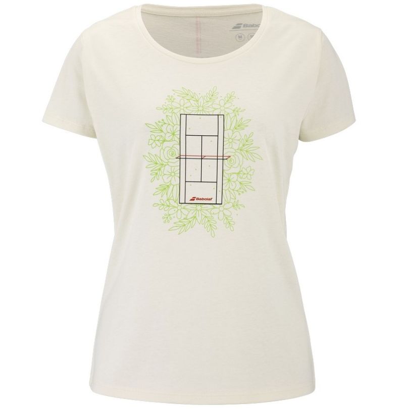 Женская теннисная футболка Babolat Exercise Message - cannoli cream. Классическая простая футболка, выполненная из мягкого, приятного на ощупь материала. Легко растягивающаяся ткань подстраивается под тело, обеспечивая свободу и комфорт во время активности. В центральной части размещен интересный графический мотив. Идеальный выбор для тренировок, игр и повседневного использования.