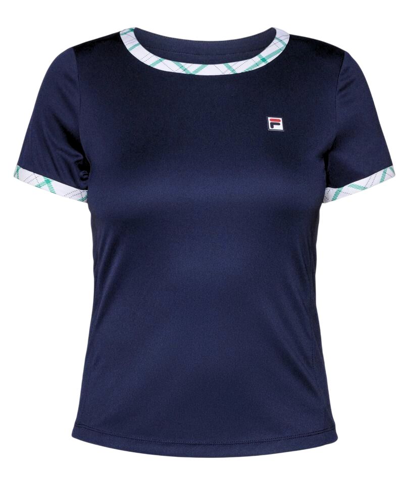 Женская теннисная футболка Fila Yamila Tennis - navy/court green check. Простая футболка, выполненная из слегка эластичного материала с закругленным подолом, обеспечит высокий комфорт во время ношения. Более свободный крой позволит на полную свободу движений. Боковые вставки из mesh-панели обеспечат лучшую вентиляцию. Целиком выполнена из дышащего, хорошо отводящего влагу полиэстерового материала, обеспечивающего отличную воздухопроницаемость. Плоские швы минимизируют риск натираний и раздражений.