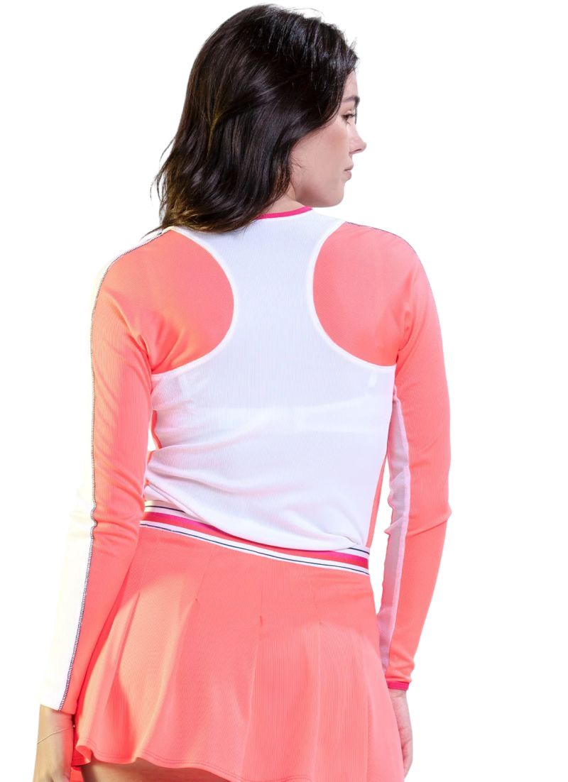 Женская теннисная футболка с длинным рукавом Lucky in Love Topspin Long Sleeve - white. Стильная футболка выполнена из эластичного, рифлёного материала, который очень хорошо прилегает к телу, обеспечивая свободу движений. Вставка из тонкой сетки на всей длине рукава обеспечит лучшую вентиляцию. Слегка удлинённая спинка и закруглённый низ обеспечат защиту и удобство носки. Плоские швы минимизируют риск натираний и раздражений. Футболка выполнена с применением технологий: Moisture Wicking, Quick Dry, UPF+15.