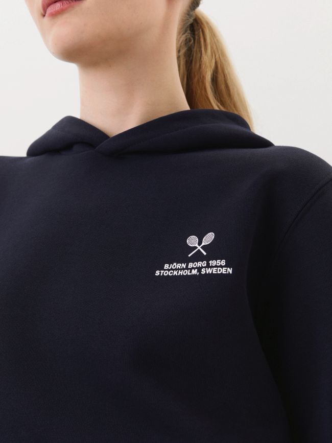 Женская теннисная толстовка Bj_rn Borg Hood Milla W в цвете night sky выполнена в классическом свободном крое с капюшоном. Манжеты на рукавах и по низу изделия эластичные, обеспечивают надежную посадку. Модель изготовлена из мягкого и комфортного материала, приятного на ощупь. Спереди расположен вместительный карман с двумя боковыми входами для удобного хранения и доступа.