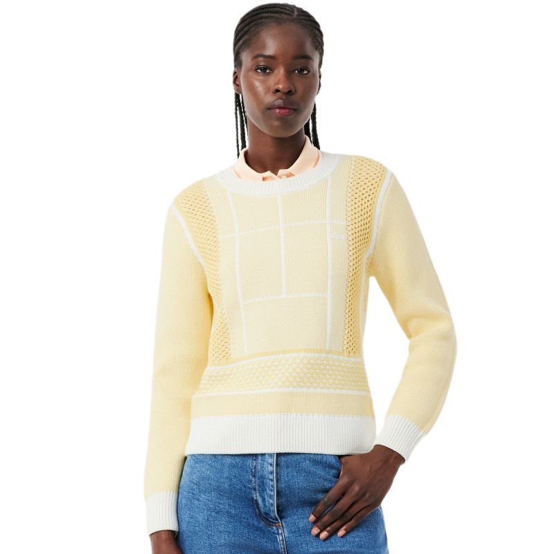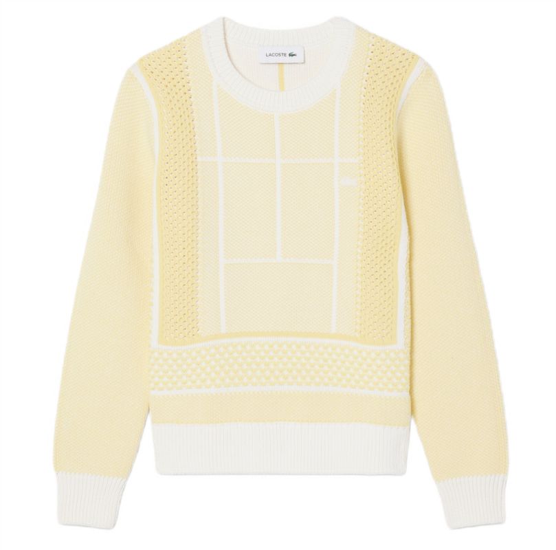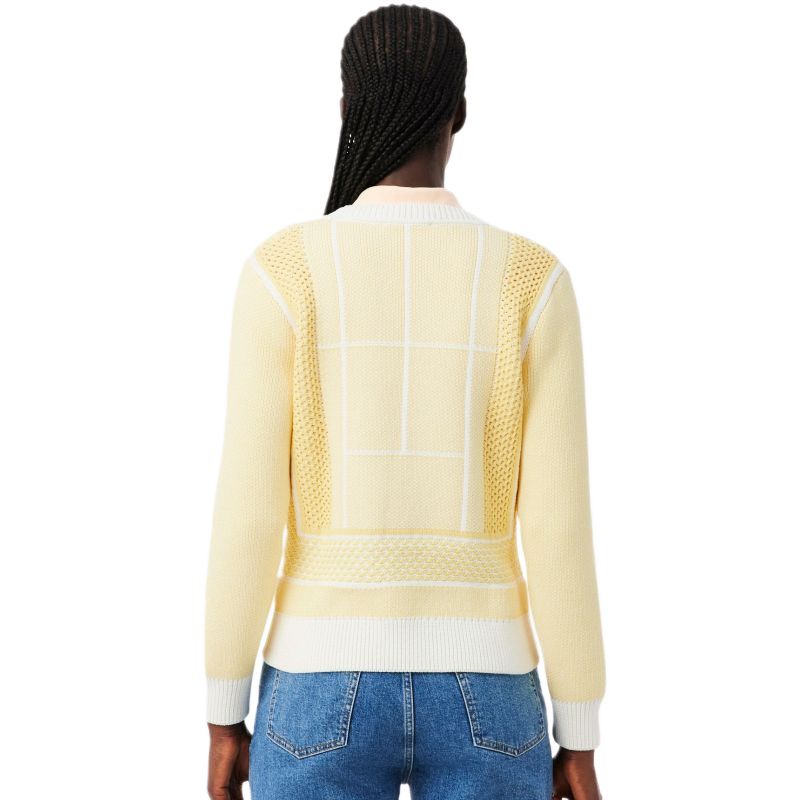 Женская кофта Lacoste Tennis Court Graphic Jacquard - flour/yellow. Элегантный свитер с классическим округлым вырезом. Выполнен с высоким содержанием хлопка, что придаёт материалу мягкость и деликатность. Рукава и низ отделаны эластичными манжетами, обеспечивающими лучшее прилегание к телу. На левой груди расположено культовое вышитое лого бренда. Идеальное дополнение гардероба для любителей классического теннисного стиля.