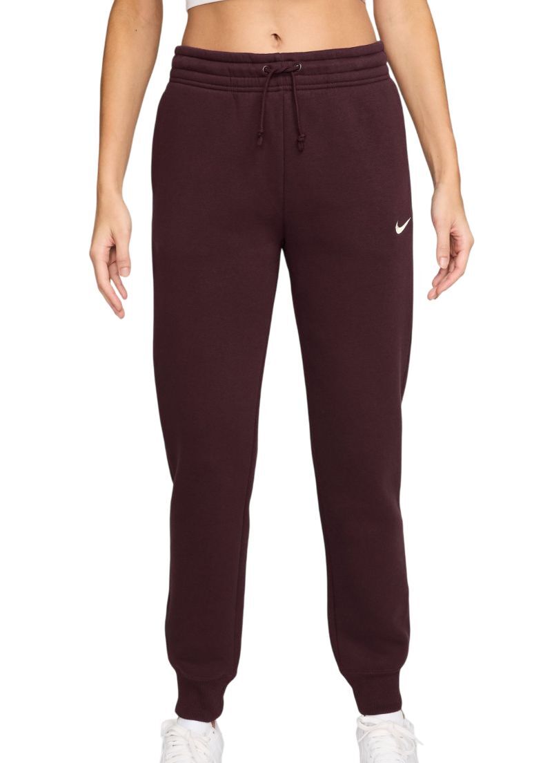 Женские брюки Nike Sportswear Phoenix Fleece - burgundy crush/sail. Брюки с классическим фасоном, обеспечивающим свободу движений. Изготовлены из приятного на ощупь и комфортного материала. Эластичная резинка на поясе со шнурком позволяет идеально подогнать изделие. Флисовая подкладка обеспечивает тепло и комфорт в холодные дни. Брюки имеют вместительные боковые карманы и логотип производителя, видимый слева. Низ брюк завершён эластичной манжетой для лучшей посадки и удобства ношения.
