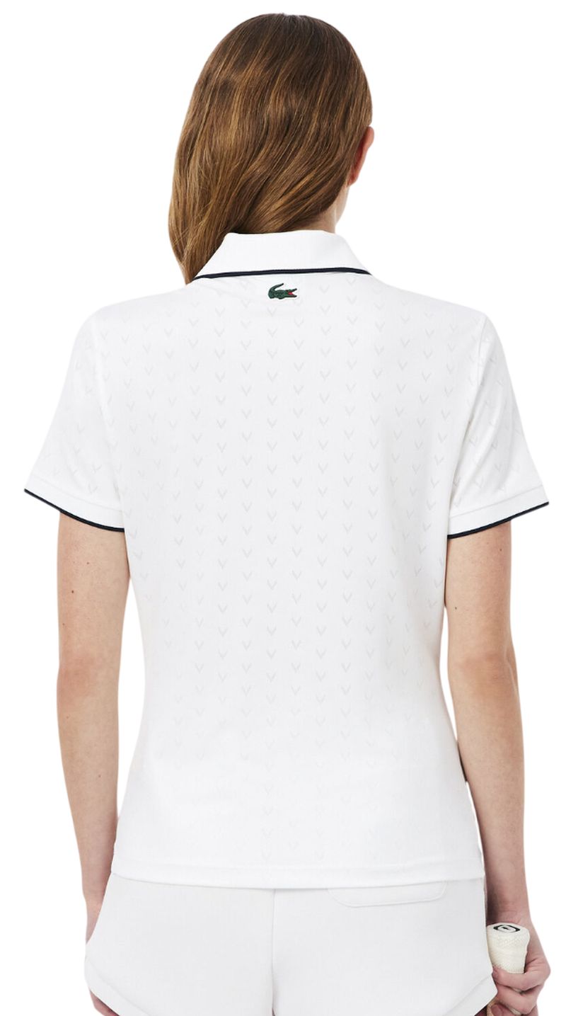 Женское поло Lacoste Tennis Heritage Ultra Dry Stretch Shirt - white. Легкое, эластичное поло, выполненное в slim fit крое, хорошо прилегает к телу, обеспечивая комфорт во время активности. Застегивается у ворота на три пуговицы, что обеспечивает удобство надевания. Принты на всей сорочке выполнены микроперфорацией, что обеспечит лучшую вентиляцию. На левой груди силиконовый значок с мотивом теннисного корта и ракетки. Наивысшее качество исполнения и используемых материалов. Поло выполнено с применением технологий: Ultra Dry, Stretch, Odor-Control.