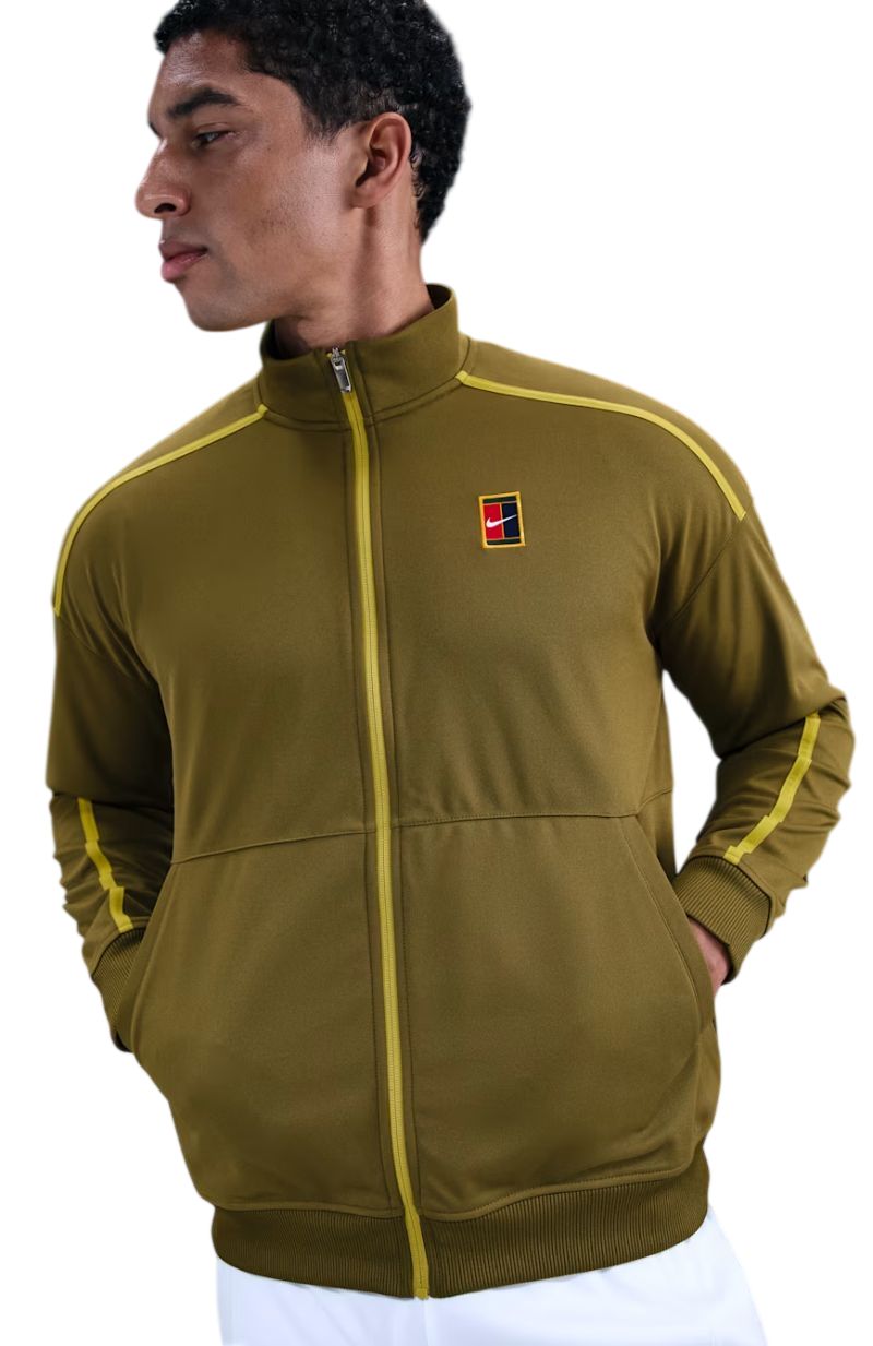 Мужская толстовка Nike Court Heritage Tennis - olive flak/saffron quartz. Изготовлена из мягкого материала, хорошо сохраняющего тепло. Ткань с лёгкой эластичностью адаптируется к движениям. Толстовка застёгивается на всю длину на молнию. Высокий воротник для дополнительной защиты. Рукава и подол толстовки завершены эластичным рифлёным материалом, обеспечивающим отличную посадку и высокий комфорт. Два открытых боковых кармана. Высокое качество исполнения и используемых материалов. Иконический логотип с левой стороны.