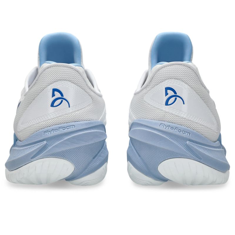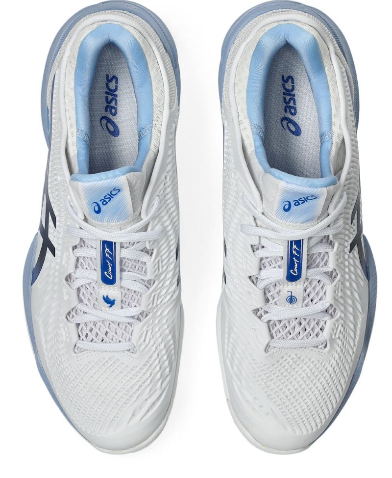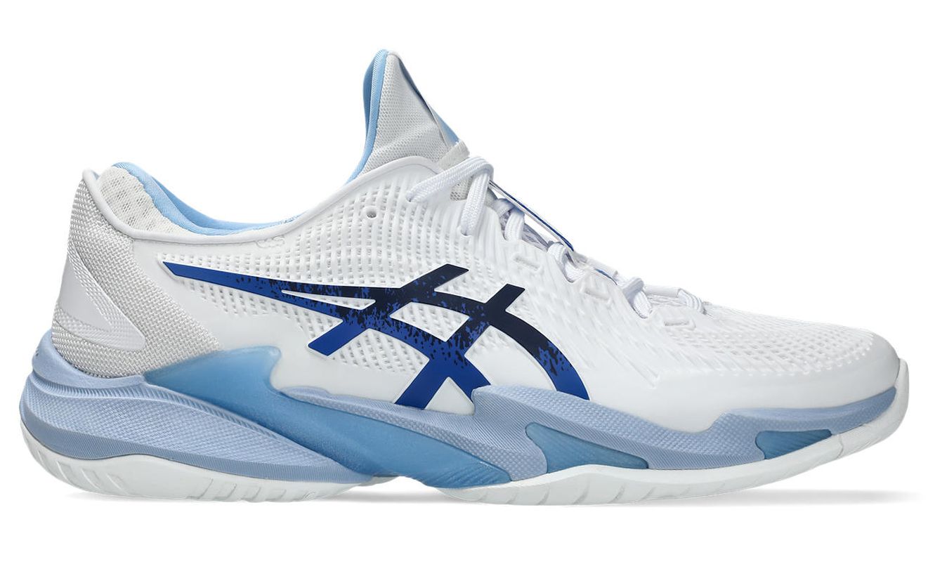 Теннисные кроссовки Asics Court FF 3 - white/tuna blue. Обновленная модель топовой серии, созданная в сотрудничестве с одним из величайших теннисистов последних лет - Новаком Джоковичем. Кроссовок обеспечивает идеальный баланс между комфортом, стабильностью и гибкостью. Он разработан таким образом, чтобы позволять максимально быстрые смены направления за короткое время и обеспечивать наилучший возврат энергии, вкладываемой в движение. Кроме того, в новой версии увеличена площадь контакта внешней подошвы с поверхностью, что приводит к снижению ощущаемых нагрузок. Конструкция с интегрированным язычком и внутренней носочкой идеально прилегает к стопе, гарантируя отличную поддержку и стабильность. Эти элементы в значительной степени выполнены из сетчатого материала, что повышает воздухопроницаемость. Система PGUARD в передней части кроссовка обеспечивает высокую прочность и устойчивость к повреждениям. Усиленный верх гарантирует долговечность. Промежуточная подошва оснащена на всей длине первоклассными гелевыми и пенными системами амортизации. Применены следующие технологии: FLYTEFOAM, FOREFOOT GEL CUSHIONING SYSTEM, TWISTRUSS, AHAR+, MONO-SOCK FIT SYSTEM. Кроссовок имеет универсальную подошву с системой non-marking.