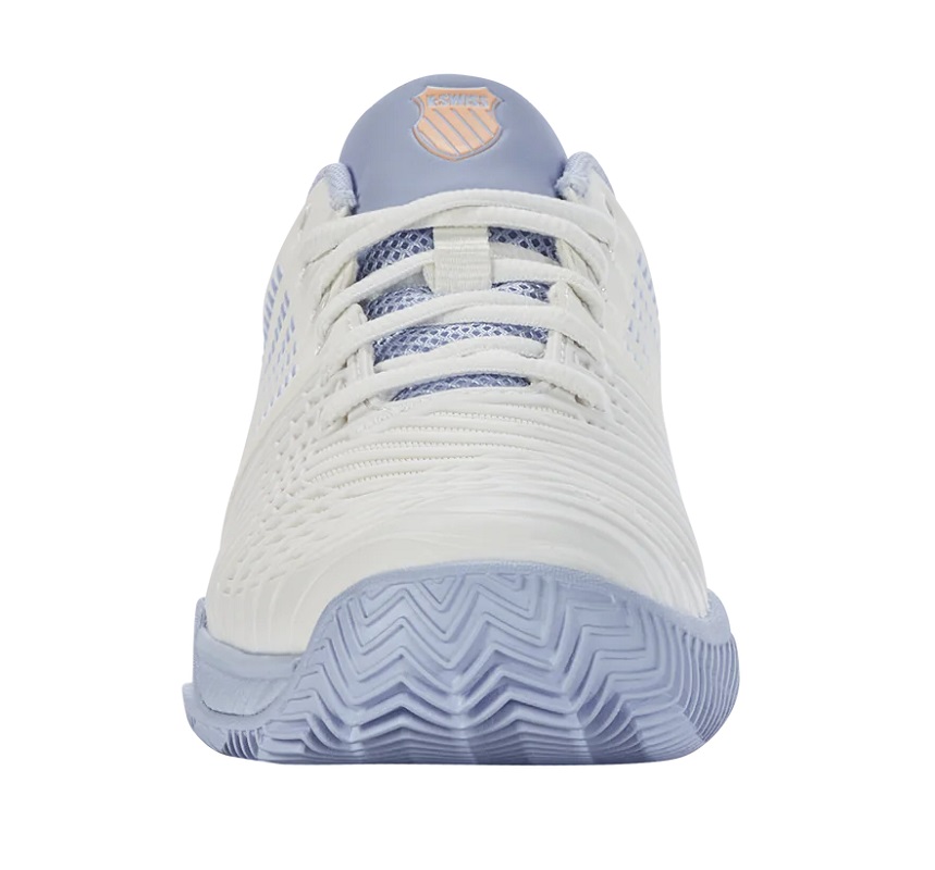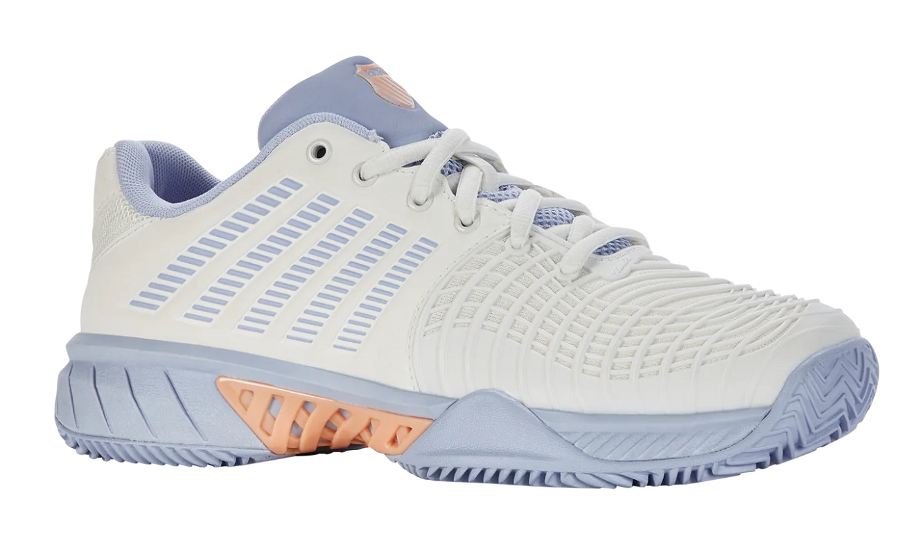 Женские теннисные кроссовки K-Swiss Express Light 3 HB - star white/heather/peach fuzz. Модель, обеспечивающая амортизацию, стабильность и скорость перемещения по корту. Создан для игроков, ищущих легкую и маневренную обувь. Более широкий крой подойдет для высокого подъема или полной стопы. Обновленный легкий верх обеспечивает повышенную воздухопроницаемость и комфорт. В зонах, подверженных наибольшему износу, добавлено резиновое усиление. Защита DuraWrap в областях интенсивного использования повышает долговечность обуви. Средняя подошва дает максимальную амортизацию, динамику отскока и возврат энергии. Верх в зоне среднестопья обеспечивает дополнительную стабильность и защиту от нежелательного скручивания. Резиновая внешняя подошва Aosta 7.0 с протектором в виде елочки и системой non-marking гарантирует отличное сцепление и хорошую износостойкость на грунтовых кортах.