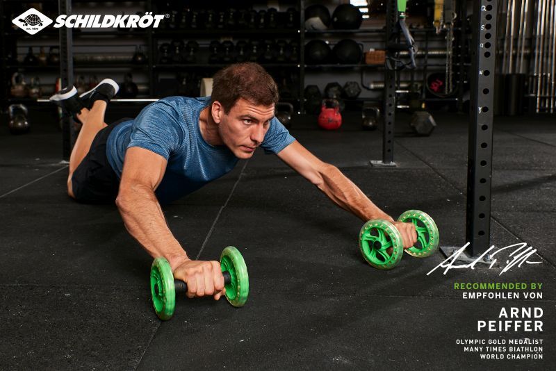 Schildkr_t Fitness Dual Core Wheels. Два двуядрных колеса с шарикоподшипниками являются динамическим тренажером для мышц кора и живота, идеально подходящим для продвинутых упражнений на предплечья и отжиманий. Колеса с обеих сторон дестабилизируют все движения, активируя глубоко расположенные мышцы в области плеч, туловища и бедер. Колеса кора движутся синхронно, безопасно и плавно. Эргономично сформированные противоскользящие ручки из пены обеспечивают исключительный комфорт. Прозрачные колеса предотвращают появление следов от ремней.