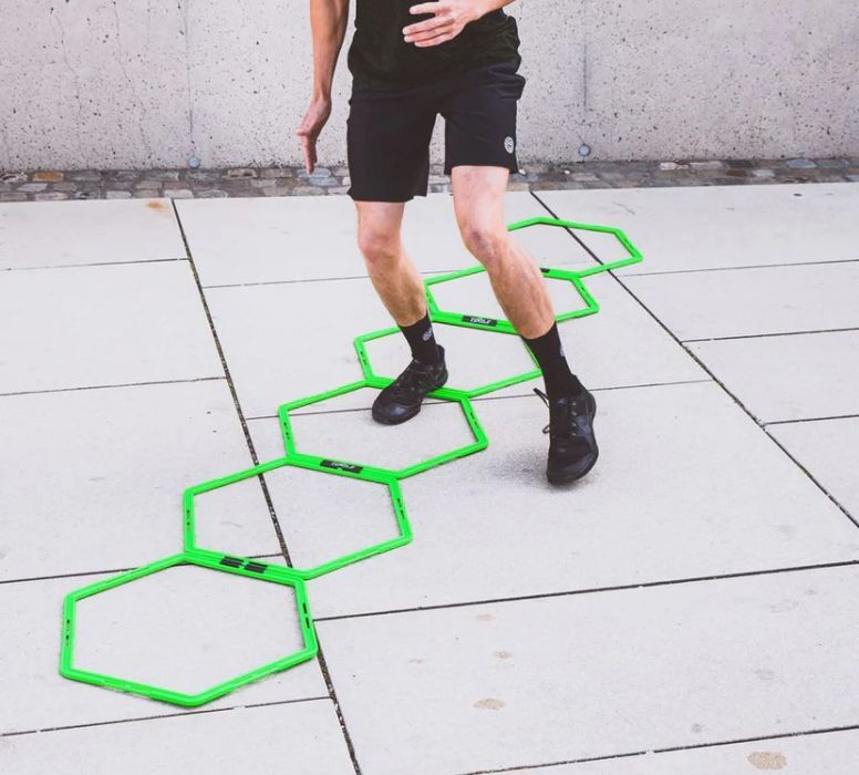Тренировочная лесенка Toolz Hexagonal Training Rings. Тренировочные маркеры, состоящие из шести шестиугольных колец, которые можно свободно соединять друг с другом, создавая широкий спектр возможных комбинаций. Идеально подходит для разнообразия тренировок координации, выносливости и скорости. Диаметр одного кольца: 50 см.