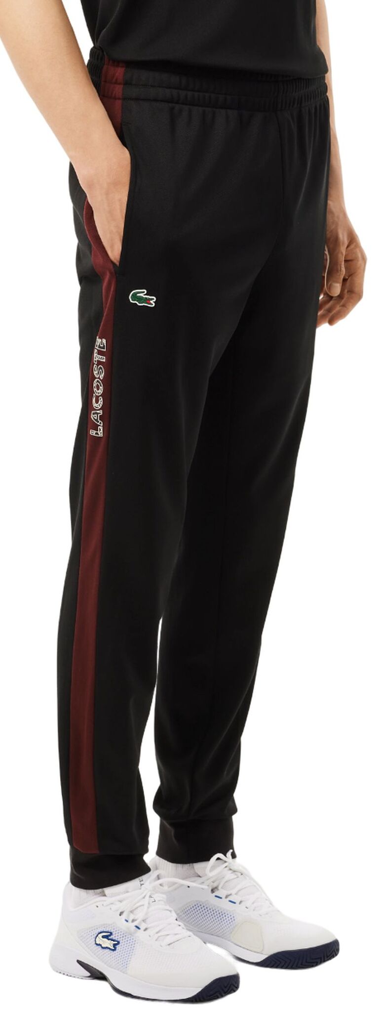 Мужские брюки Lacoste Logo Tennis Track — классические спортивные брюки прямого кроя. Изготовлены из высококачественного полиэстерового материала, имеют внутреннюю подкладку из легкого флиса, которая повышает защиту от холода и комфорт при носке. На сайте tennis-24.ru вы найдете этот товар с эластичной резинкой на поясе с регулировкой в виде внутренних шнурков и зауженными книзу штанинами, что позволяет идеально подогнать брюки под фигуру. Два боковых кармана с открытым доступом. Брюки украшены боковыми лампасами и культовым логотипом производителя под правым карманом.