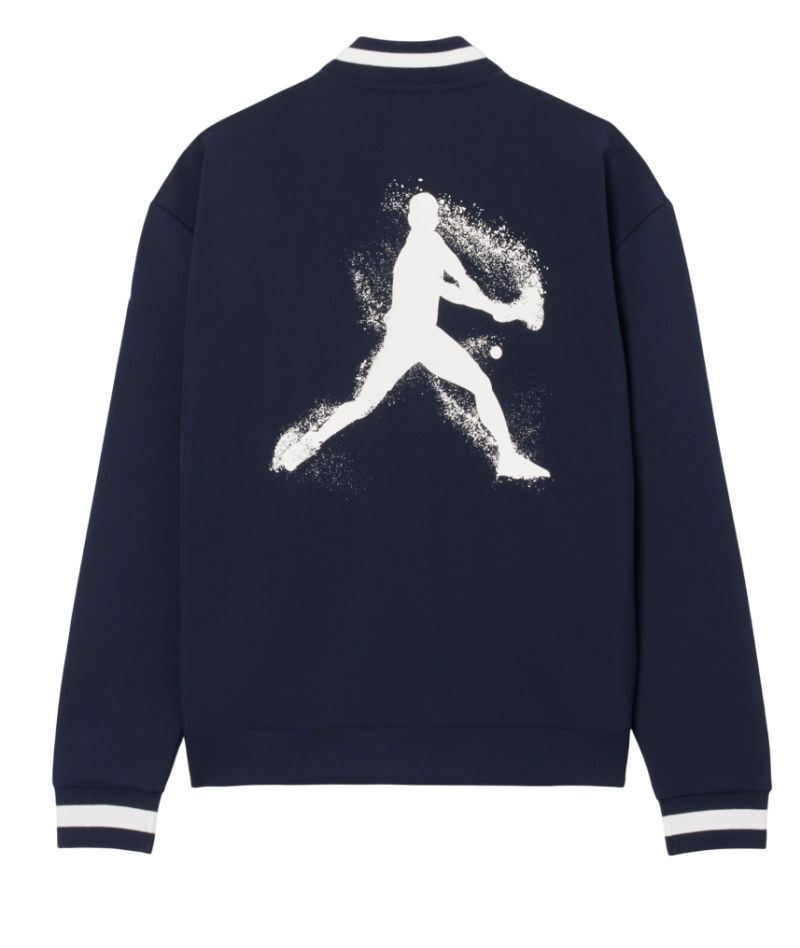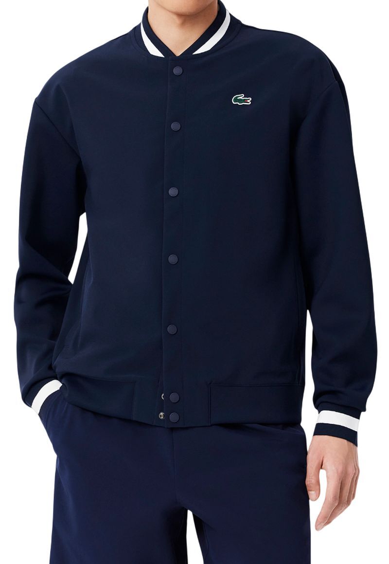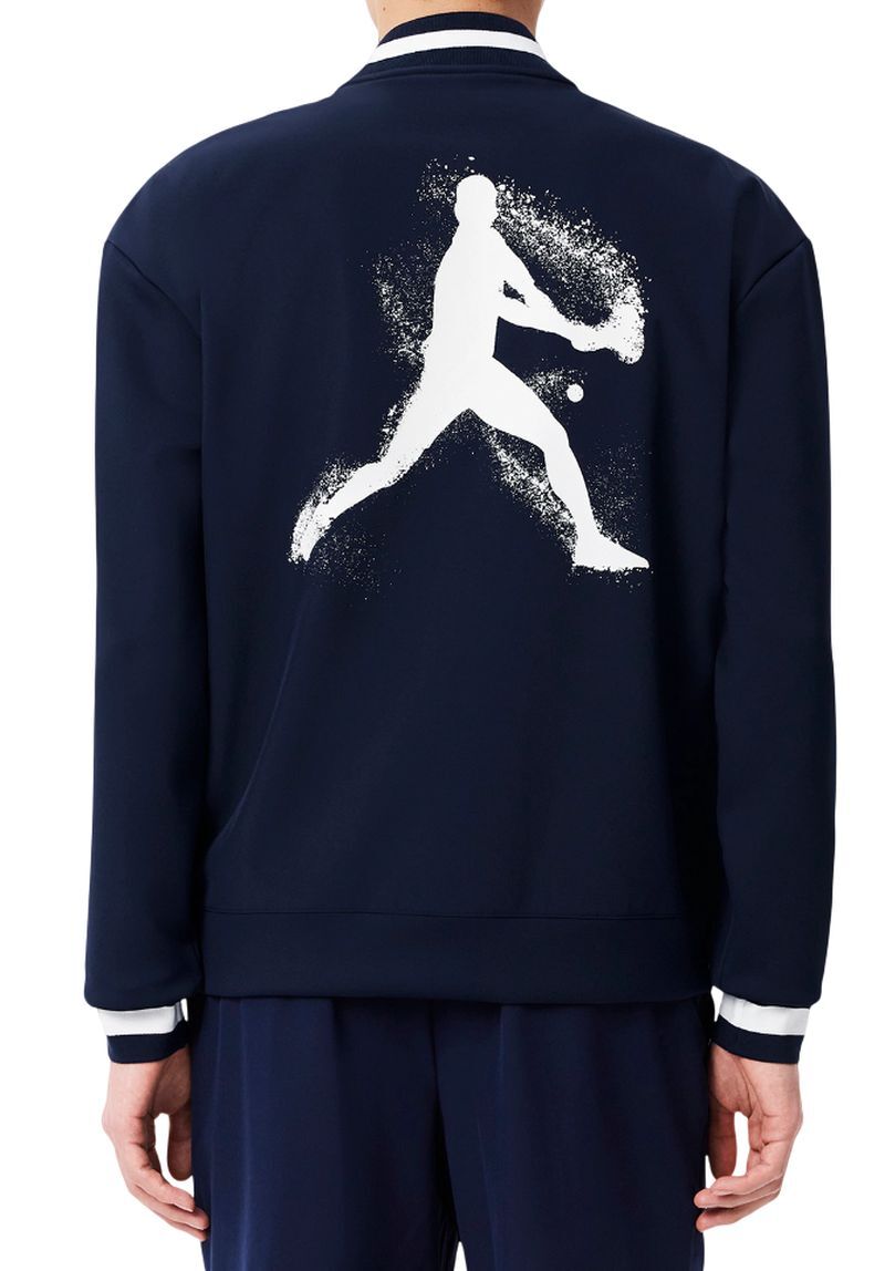 Мужская толстовка Lacoste Bunda Lacoste Tennis x Novak Djokovic - navy. Стильная толстовка выполнена в простом крое, застегивается на всю длину на кнопки, что обеспечивает высокий комфорт ношения и свободу движений. Рукава заканчиваются ребристым, сужающимся материалом, обеспечивающим лучшее прилегание и удобство использования. Два боковых кармана на молниях. Внутренний материал выполнен из сетки, что обеспечивает лучшую воздухопроницаемость. Толстовка изготовлена из технического, гидрофобного материала. На сайте tennis-24.ru вы найдете эту модель с эксклюзивным дизайном. Толстовка украшена большой графикой на спине с изображением силуэта Новака Джоковича. Дополнительно на левом рукаве видна характерная подпись теннисиста.