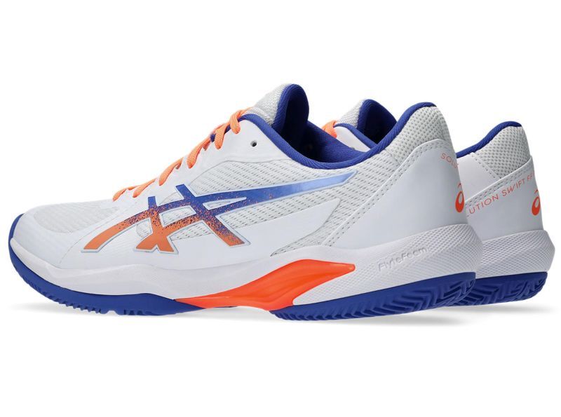 Мужские кроссовки для падела Asics Solution Swift FF 2 Padel - white/dark cobalt. Отличающаяся легкостью модель Solution Swift FF 2 обеспечивает очень хорошее ускорение, особенно на первых этапах старта. Переработанный верх с большими зонами из сетки обеспечивает отличную вентиляцию. Магазин tennis-24.ru предлагает только оригинальные модели с гарантией качества. Многочисленные усиления в уязвимых местах увеличивают прочность. Передняя часть подошвы оснащена системой PGUARD для лучшей износостойкости и защиты от механических повреждений. Средняя подошва из энергетической пены FLYTEFOAM гарантирует первоклассную амортизацию и отличный возврат энергии при отталкивании. Также применена технология TRUSSTIC, поддерживающая стабильность. Обувь оснащена подошвой, предназначенной для игры на кортах для падела.
