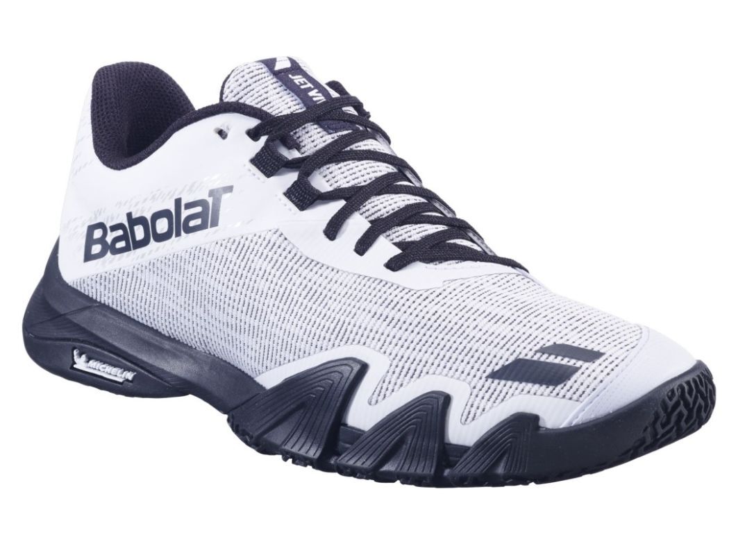 Мужские кроссовки для Падел Babolat Jet Viva - white/black. Легкая и комфортная модель с подошвой Michelin, созданной специально для игры на искусственной траве. Сетчатый верх с низким весом обеспечивает хорошую воздухопроницаемость и динамичность движений на корте. Магазин tennis-24.ru предлагает эту модель, которая в уязвимых местах усилена резиновыми накладками. Язык с частично интегрированной конструкцией обеспечивает хороший уровень поддержки стопы, надежно удерживая ее в обуви при резких движениях. Технология KPRS-X, расположенная под пяткой, гарантирует соответствующую амортизацию.
