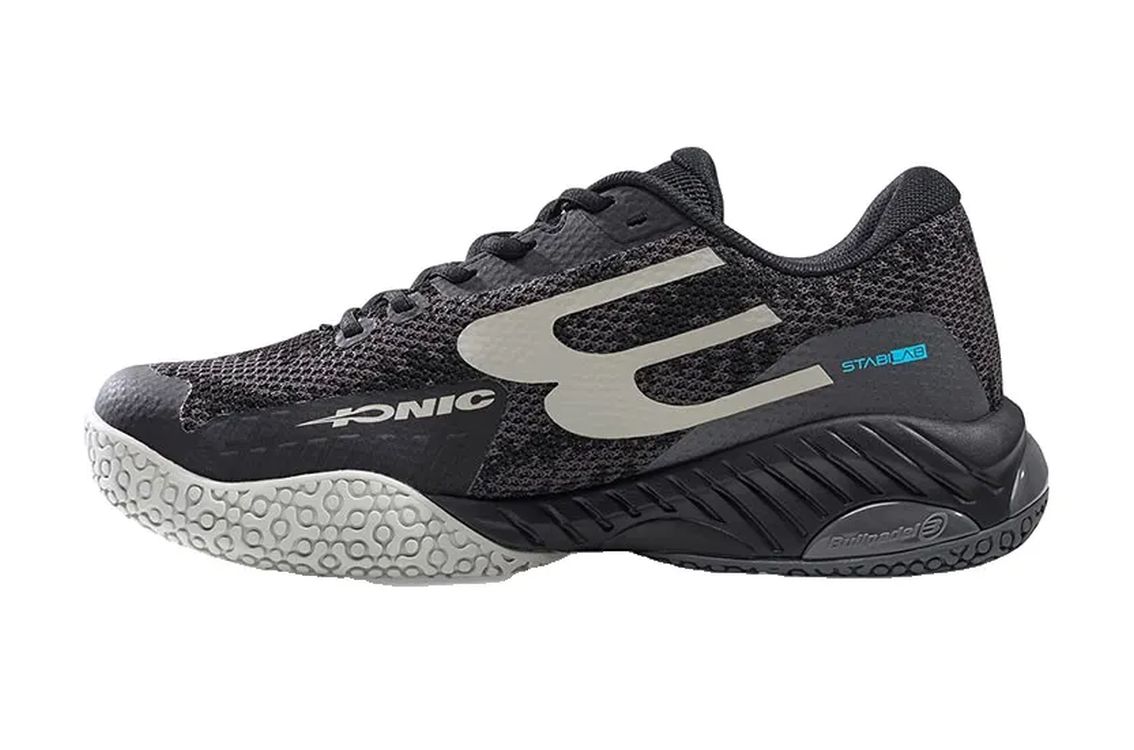 Мужские кроссовки для Падел Bullpadel Ionic 26V - black. Обеспечивают максимальную производительность на кортах падела. Верх выполнен из жаккардовой сетки с плотным плетением, которая обеспечивает высокую прочность и отличную воздухопроницаемость. Дополнительные усиления носочной части и внутренней зоны повышают устойчивость к износу. Средняя подошва имеет пенную амортизацию, гарантирующую высокий комфорт игры, и оснащена системой Bull Stabilizer, отвечающей за стабилизацию стопы при резких боковых движениях. Частично интегрированный язычок обеспечивает отличную посадку и дополнительную поддержку стопы. Продольный канал Lateral Movement во внешней подошве компенсирует поддержку стопы за счет бокового расширения подошвы при каждом шаге, что дополнительно повышает комфорт и уверенность в движениях. Гибридная конструкция протектора, разработанная специально с учетом специфики покрытий падела, частично состоит из рисунка в виде елочки и зон, повышающих сцепление.