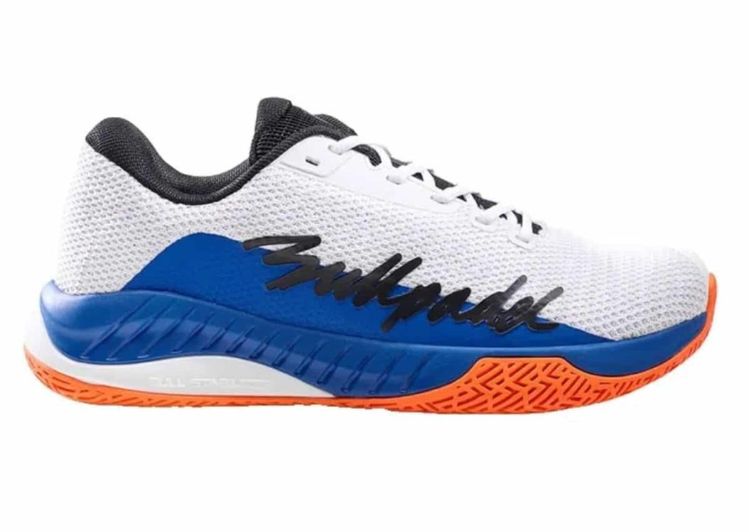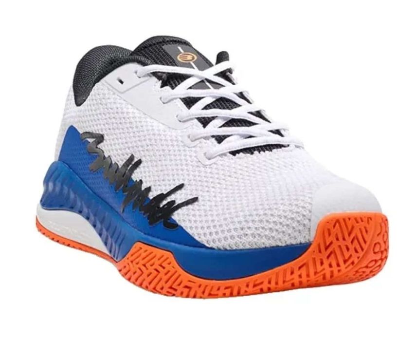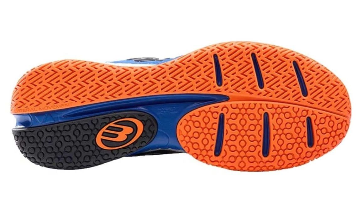 Мужские кроссовки для Падел Bullpadel Ionic 26V - blue. Обеспечивают максимальную производительность на кортах падела. Верх выполнен из жаккардовой сетки с плотным плетением, которая сочетает высокую прочность и очень хорошую воздухопроницаемость. Дополнительные усиления носка обуви и внутренней зоны повышают устойчивость к износу. Средняя подошва имеет пенную амортизацию, гарантирующую высокий комфорт игры, и оснащена системой Bull Stabilizer, отвечающей за стабилизацию стопы во время резких боковых движений. Частично интегрированный язычок гарантирует отличную посадку и дополнительную поддержку стопы. Продольный канал Lateral Movement в внешней подошве компенсирует поддержку стопы за счет бокового расширения подошвы при каждом шаге, что дополнительно повышает удобство и уверенность в движениях. Гибридная конструкция протектора, специально разработанная с учетом специфики покрытий падела, состоит частично из ёлочки и зон, повышающих сцепление.