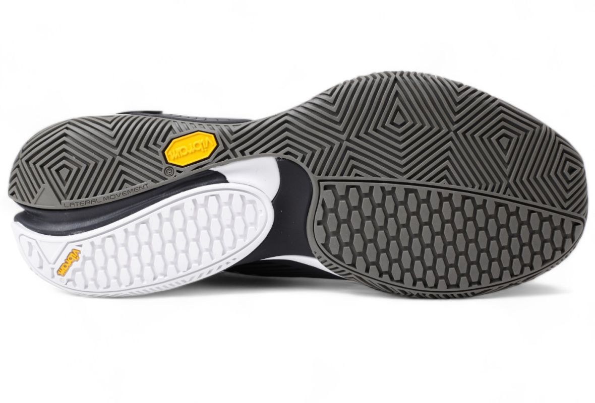Мужские кроссовки для Падел Bullpadel Vertex Vibram 26V - black. Необычайно комфортная модель, обеспечивающая высокую производительность во время интенсивной игры в падел. Легкий трикотажный верх с микроперфорацией обеспечивает очень хорошую воздухопроницаемость. Резиновые усиления носка обуви и уязвимых боковых зон повышают износостойкость. Частично интегрированный язычок обеспечивает очень хорошую поддержку стопы, а дополнительный стабилизатор в средней подошве — отличную поворотную стабильность. Относительно широкий крой подойдет для высокого подъема стопы. Средняя подошва, выполненная из пены EVA двойной плотности, предлагает амортизацию высшего класса. Наружная подошва, в разработке которой участвовал мировой лидер по производству подошв Vibram, имеет гибридную конструкцию — частично состоит из узора «елочка» и зон, повышающих сцепление и долговечность, что обеспечивает идеальную тягу. Кроме того, она оснащена элементом CATAPULT, действующим как система помощи для более эффективного возврата энергии при следующем ударе, а также продольным каналом Lateral Movement, который компенсирует поддержку стопы за счет бокового расширения подошвы при каждом шаге, что дополнительно повышает комфорт и уверенность в движениях. Прочие технологии: BPS STABILIZER, ORTHOLITE.