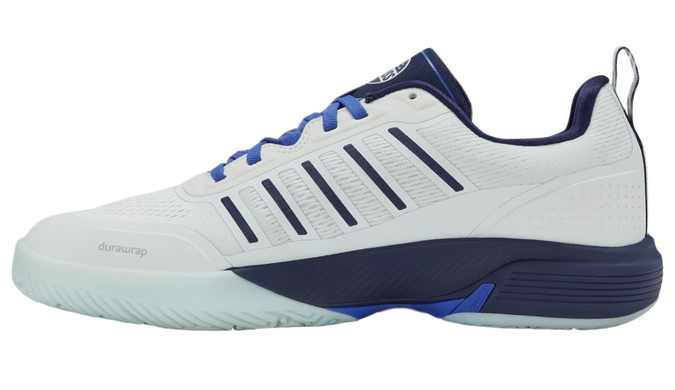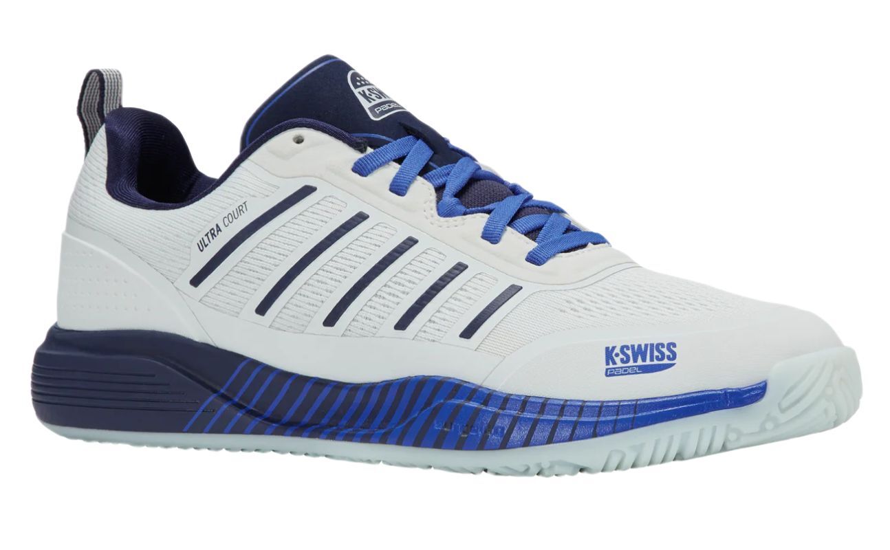Мужские кроссовки для Падел K-Swiss Ultra Court Padel - bit of blue/naval academy/dazzling blue. Выбор легенды мирового падела, Sanyo Gutierreza! Модель Ultra Court Padel — это легкая и комфортная обувь, разработанная с учетом особенностей передвижения по падельному корту. Верх выполнен из сетки с бесшовной конструкцией, обеспечивающей отличную воздухопроницаемость и комфорт при использовании. Критически важные зоны вокруг пальцев и пятки, наиболее подверженные износу, дополнительно усилены материалом Durawrap, что также обеспечивает хорошую поддержку стопы. Магазин tennis-24.ru предлагает только оригинальные модели, которые отвечают самым высоким требованиям спортсменов. Мягкая средняя подошва с системой Surgelite предлагает оптимальную амортизацию. Технология 180 PSC стабилизирует скручивание средней части стопы, гарантируя уверенность при боковых движениях и защищая голеностопный сустав от вывихов. Внешняя подошва с системой Dragguard и протектором, специально адаптированным для падельных покрытий, обеспечивает хорошую износостойкость и сцепление.