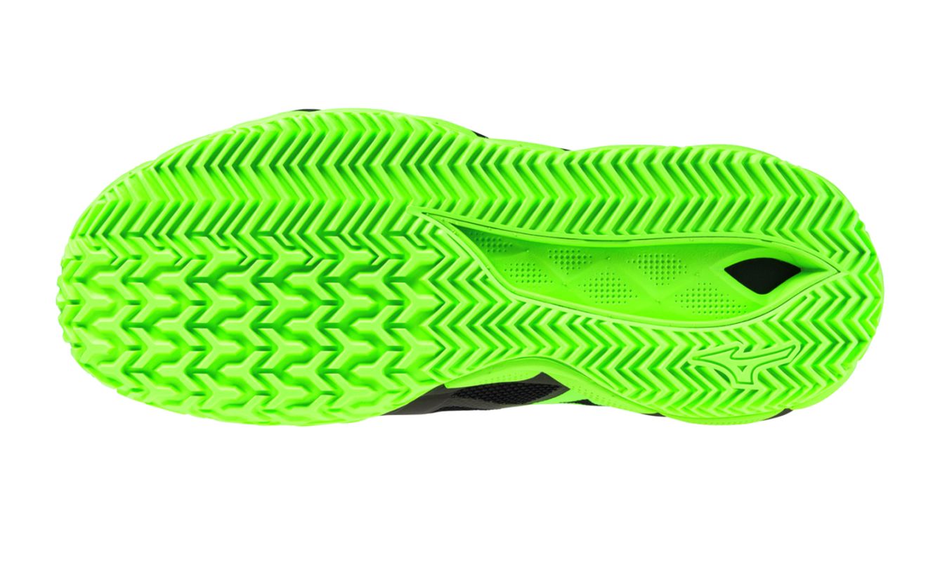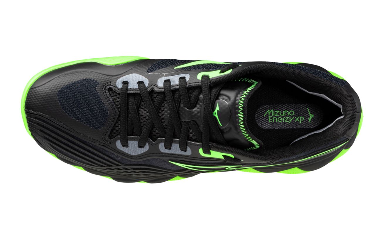 Мужские кроссовки для Падел Mizuno Wave Enforce Tour 2 Padel - black/foliage green/glowing ap. Модель, сочетающая отличную стабильность с высоким комфортом игры, при этом не теряя легкости. Разработана с учетом сильных игроков, чья игра основана на агрессивном перемещении, обеспечит им чрезвычайно надежное удержание стопы, особенно во время боковых движений. Многочисленные усиления в критических зонах пятки и верха, а также облегающая область лодыжки структура подкладки предлагают максимальную поддержку и большую долговечность. Язычок с частично интегрированной конструкцией позволяет идеальную подгонку, дополнительно стабилизируя стопу. Реактивная средняя подошва обеспечивает эффективный возврат энергии, вкладываемой в перемещение, позволяя динамичные прыжки и смены направления. Также очень хорошо амортизирует все удары. Инновационный рисунок протектора спроектирован специально для игры на покрытиях падела. Применены технологии: Mizuno Wave, Mizuno Enerzy NXT, Mizuno Enerzy, D-Flex Groove, Pownce.