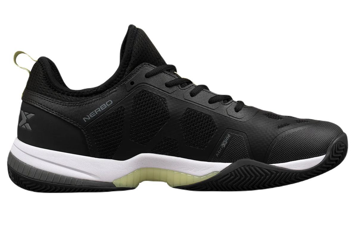 Мужские кроссовки для Падел NOX Nerbo - black/soft lime. Обувь NOX была специально разработана для минимизации риска травм и оптимизации производительности игрока на падельном корте. Протестирована в лаборатории, имеет клинические сертификаты Центра Технологий Обуви INESCOP в Аликанте, Испания. В модели NOX Nerbo использована интегрированная конструкция язычка с встроенным внутренним носком, что максимально повышает уровень поддержки и прилегания к стопе пользователя. Магазин tennis-24.ru предлагает только оригинальные кроссовки NOX, чтобы вы могли быть уверены в качестве и надежности вашей экипировки. Применение технологии LATERAL SUPPORT дополнительно увеличивает стабильность, особенно при боковых движениях. Верх выполнен из дышащей сетки и имеет эластичные резиновые усиления ABRAXONE в наиболее подверженных истиранию зонах пальцев и внутренней стороны стопы. Внутренняя стелька ORTHOLITE с антибактериальными свойствами и уменьшающая ощущение усталости обеспечивает отличный комфорт во время игры, а технология AGG, расположенная под пяткой, снижает перегрузки и способствует амортизации. Протектор Optimal GRIP гарантирует отличное сцепление с поверхностями для паделя.